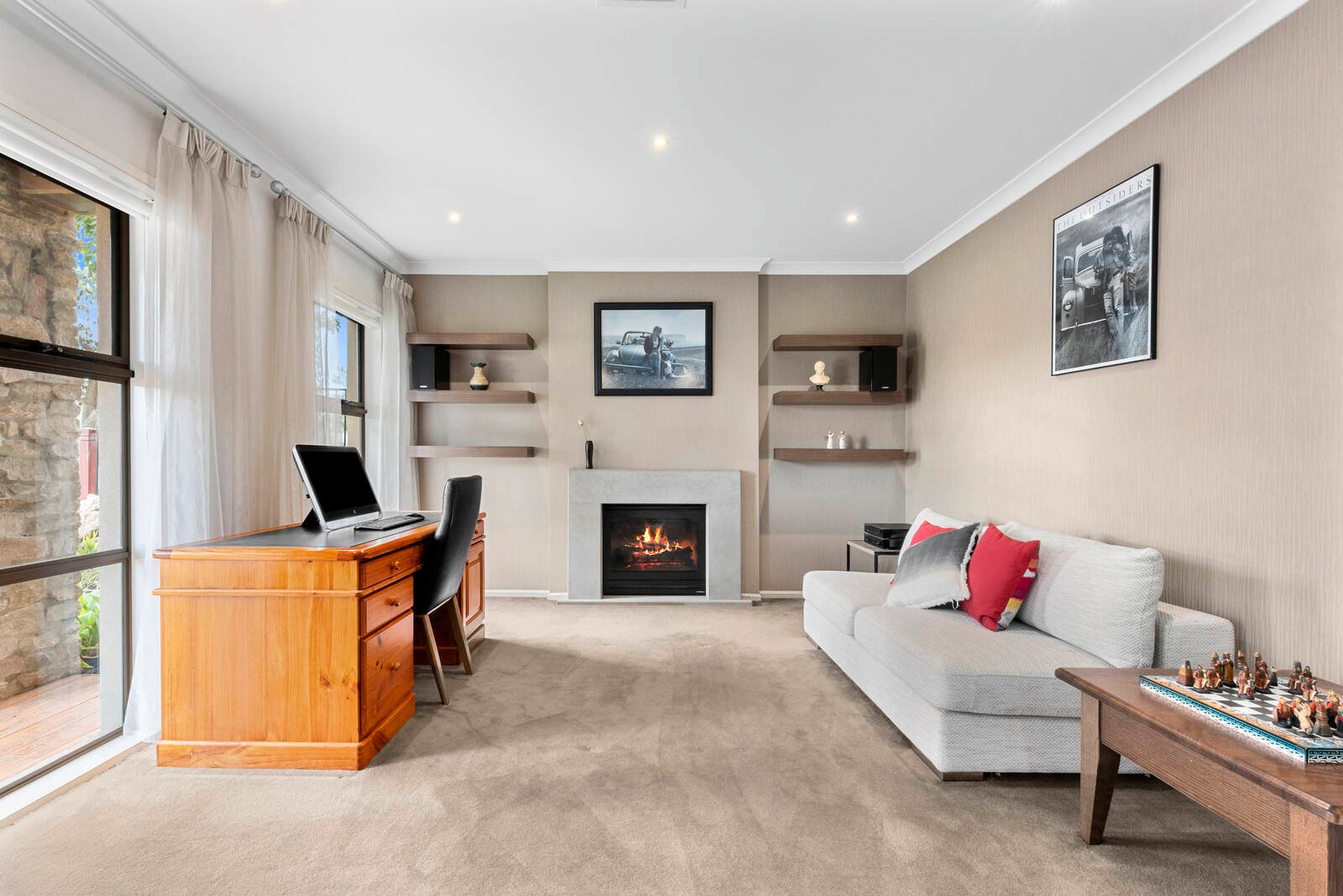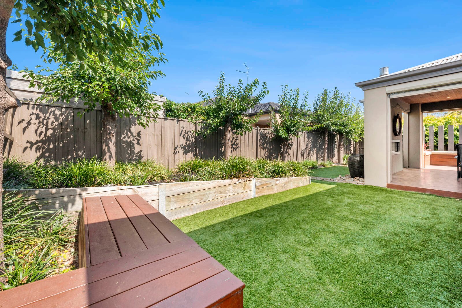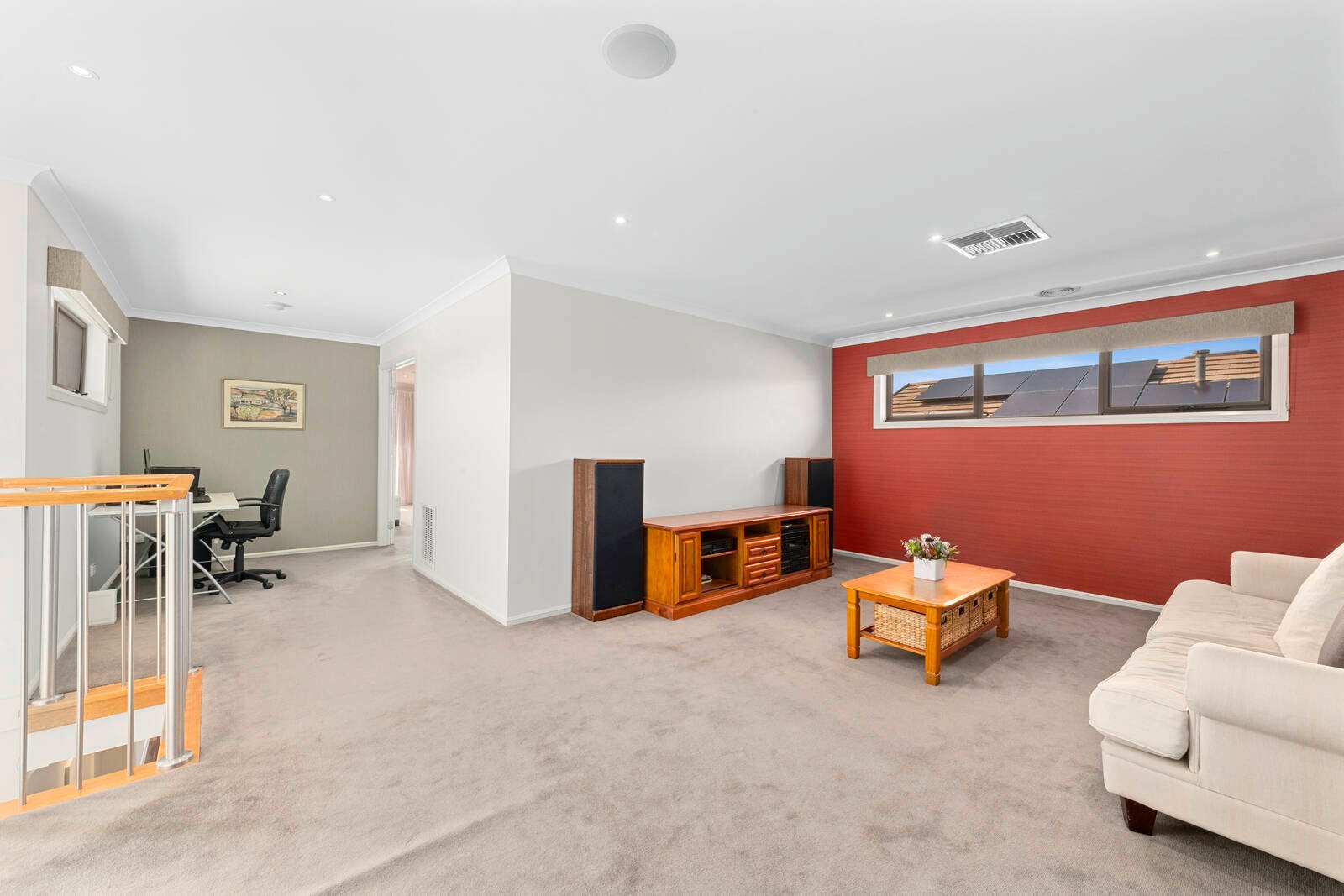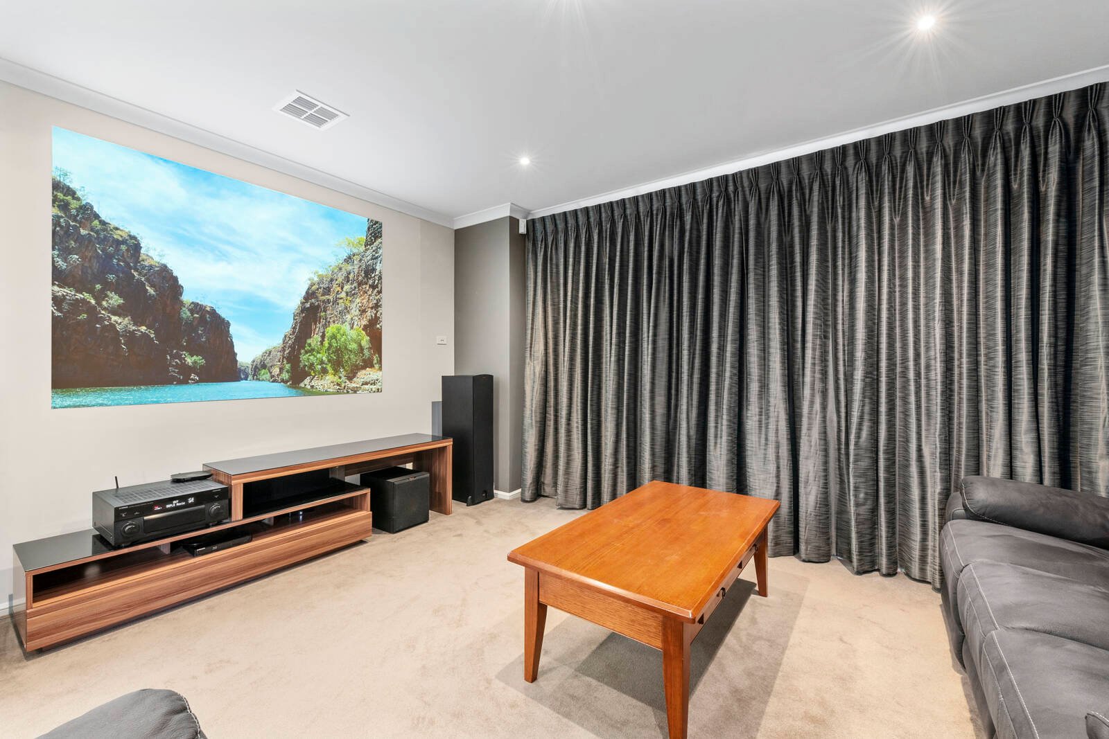 A blend of rendered and stone finishes set behind lush established gardens forms an impressive introduction to the home. Stepping inside, a wide central hallway, rich polished timber flooring, tasteful colour palette and feature timber-lined ceiling creates an amazing wow-factor on entry.