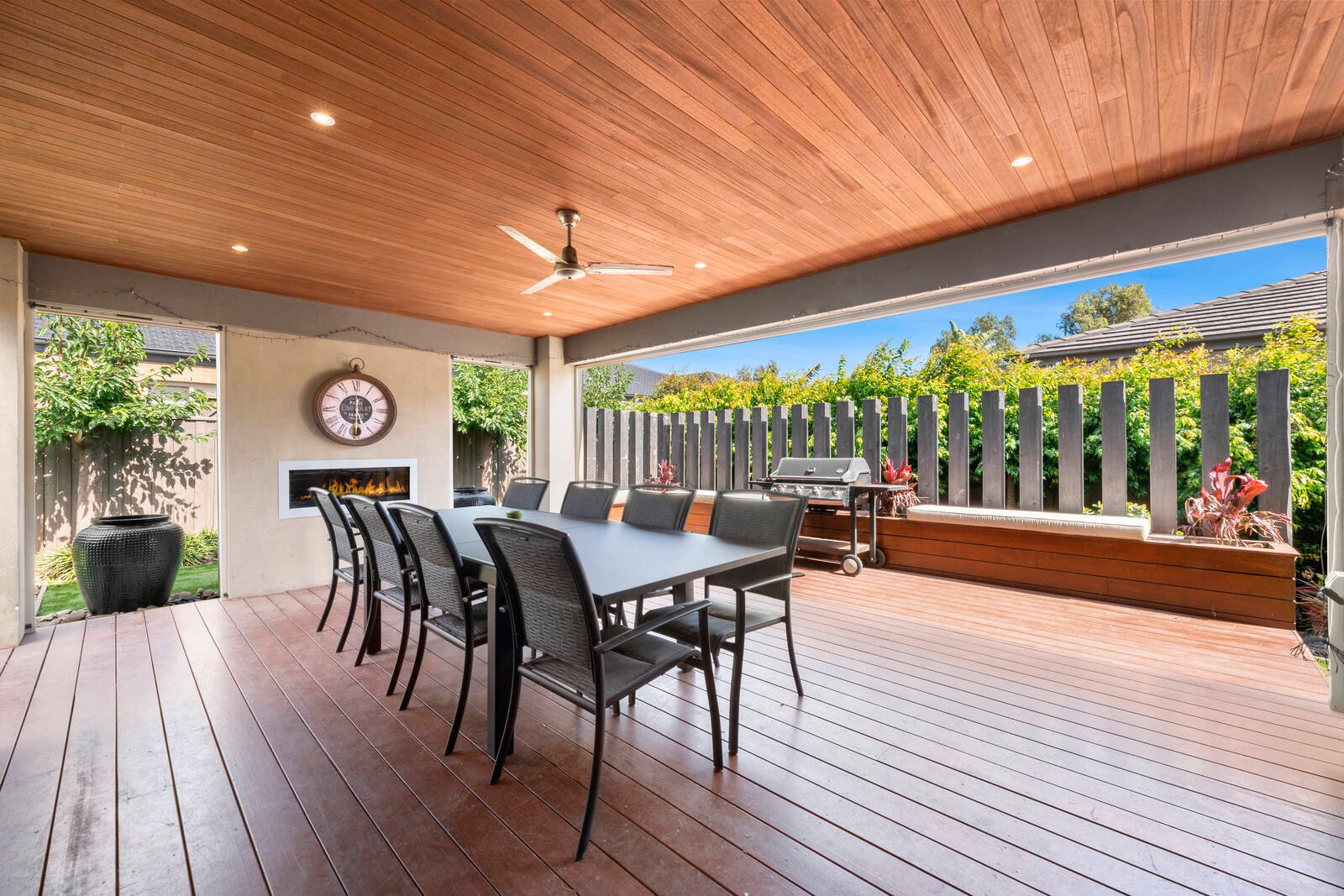 A dedicated theatre room plus additional rumpus room adjoin the main living providing a selection of alternative spaces to relax, retreat, play, party or entertain! The rear rumpus room opens up via timber bi-folds to create a seamless flow into generous the undercover alfresco which features a gas log fire, ceiling fan, timber-lined ceiling with downlights and extends out to a sun deck with built-in seating. The outdoor entertaining area overlooks beautifully maintained established gardens providing a private and tranquil atmosphere to be enjoyed all year round.