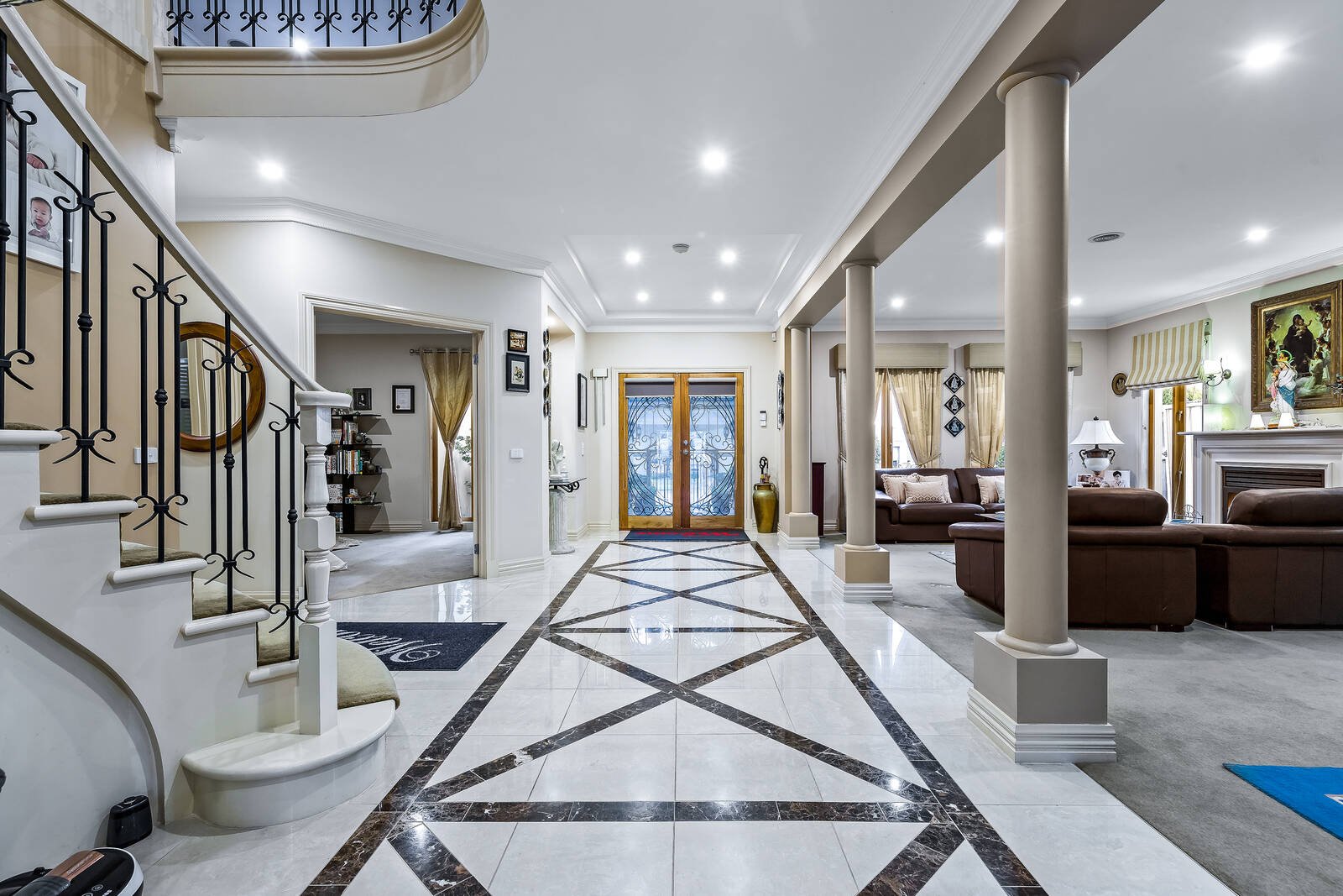Striking manicured gardens and regal wrought-iron gates provide this stately two-storey home with magnificent first impressions. Solid cedar doors lead to a cathedral scaled formal lounge/dining area and reception hall, which comprises the first half of the ground floor domain. Here, contrasting marble-inlaid porcelain tiles and distinguished pillars are, without a doubt, awe-inspiring whether entertaining on a vast scale for friends or intimately around the gas fireplace with family.