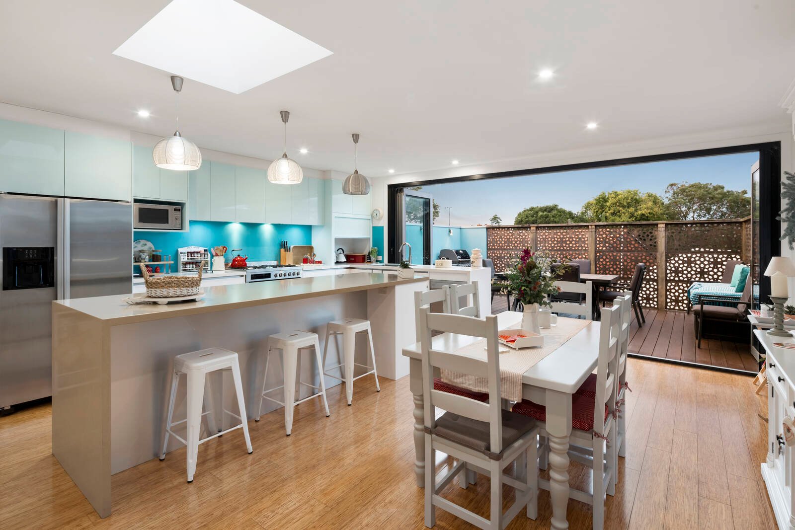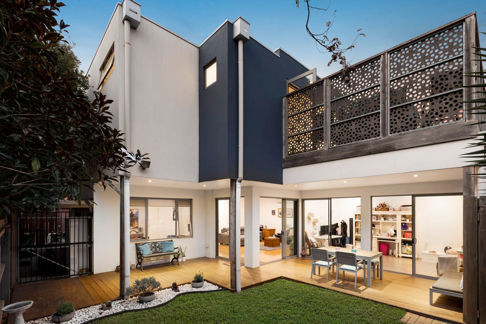 Upstairs you are welcomed by an open-plan living area sundrenched with natural light that features an impressive luxury kitchen with island bench and quality appliances. Floor-to-ceiling glass stacker doors give access to the front terrace, which provides the perfect place to take in the views of the city skyline in peace and quiet. This is complimented by a substantial dining and living space, opening bi-fold doors to the wonderful outdoor entertaining and barbeque area, enclosed by laser-cut feature walls.