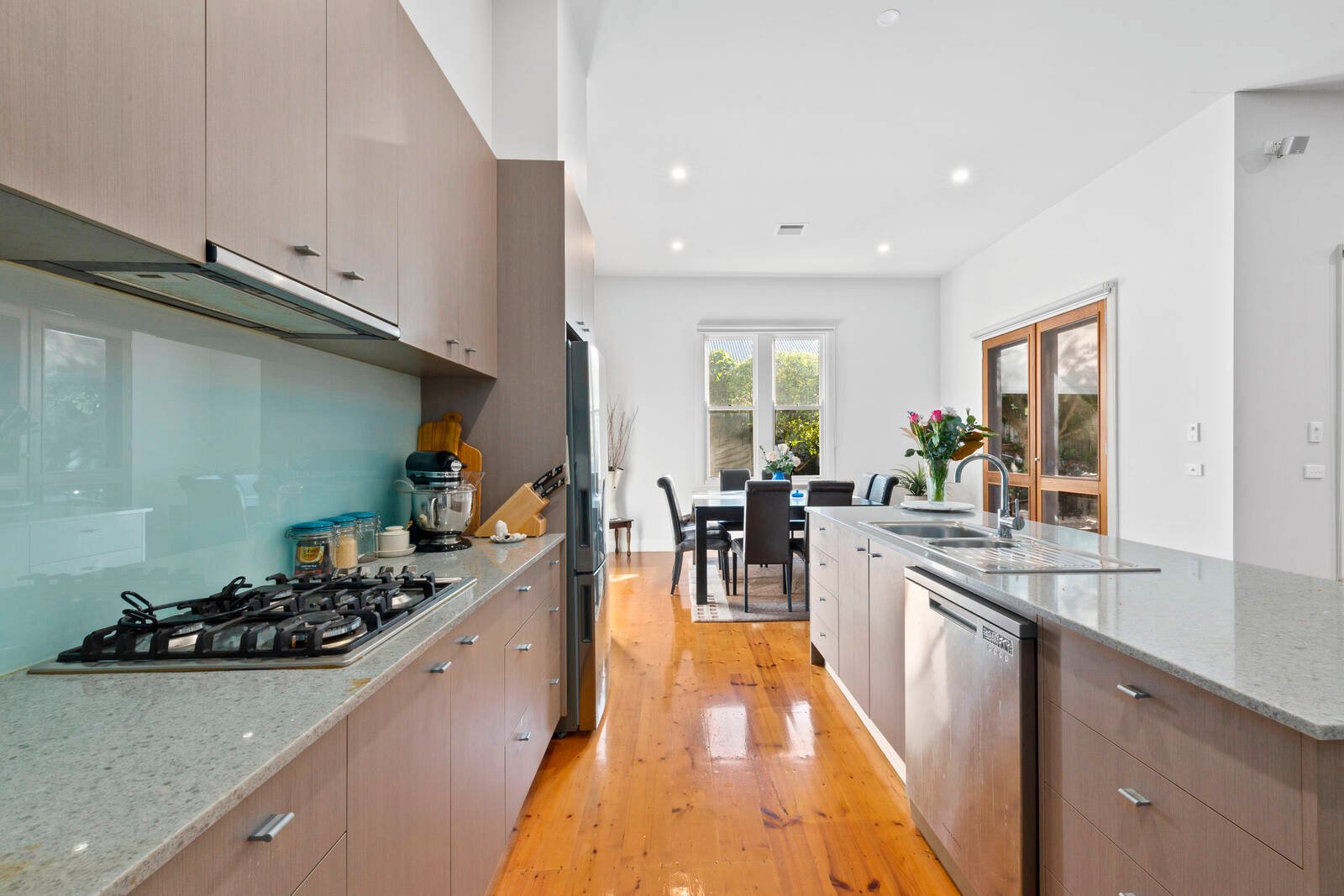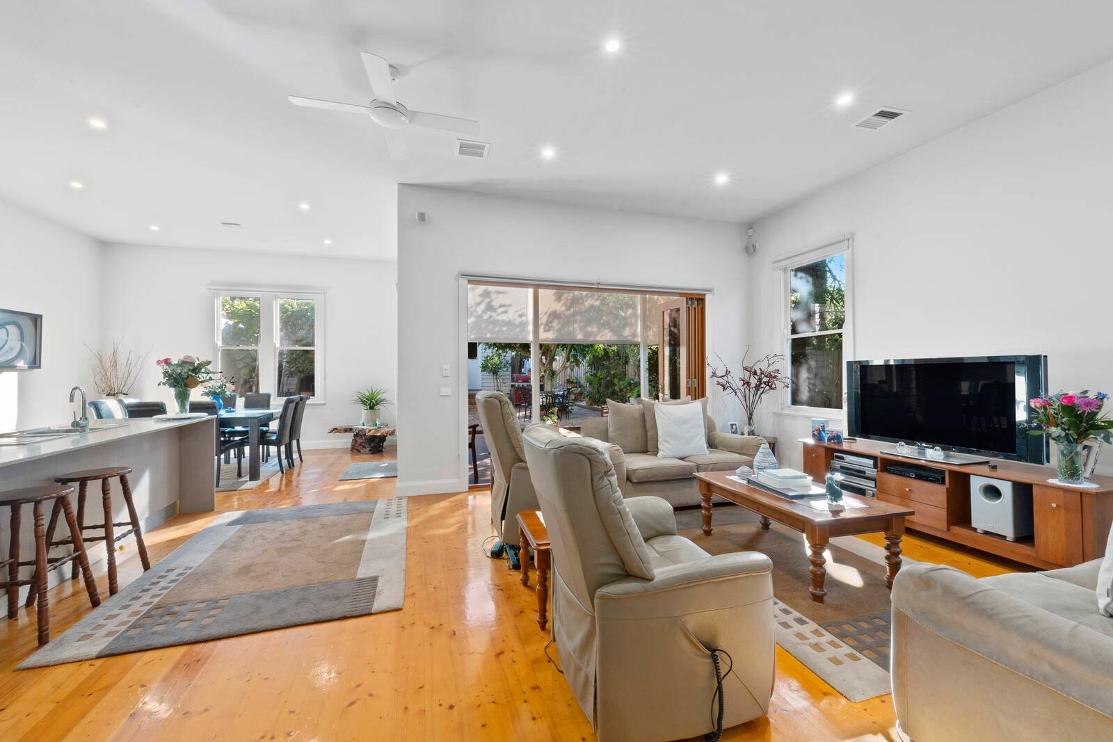 The main living area consists of an open plan kitchen, dining and lounge. The well-equipped kitchen features and island bench, stone benchtops, quality stainless steel appliances, large walk-in pantry, and is well-positioned to oversee the dining and out to the alfresco, perfect for those who love to entertain! The living area opens up to the outdoors via stunning timber bi-folds and brings the outdoors in, French doors also connect the dining area, extending your entertaining space with an effortless indoor/outdoor flow.