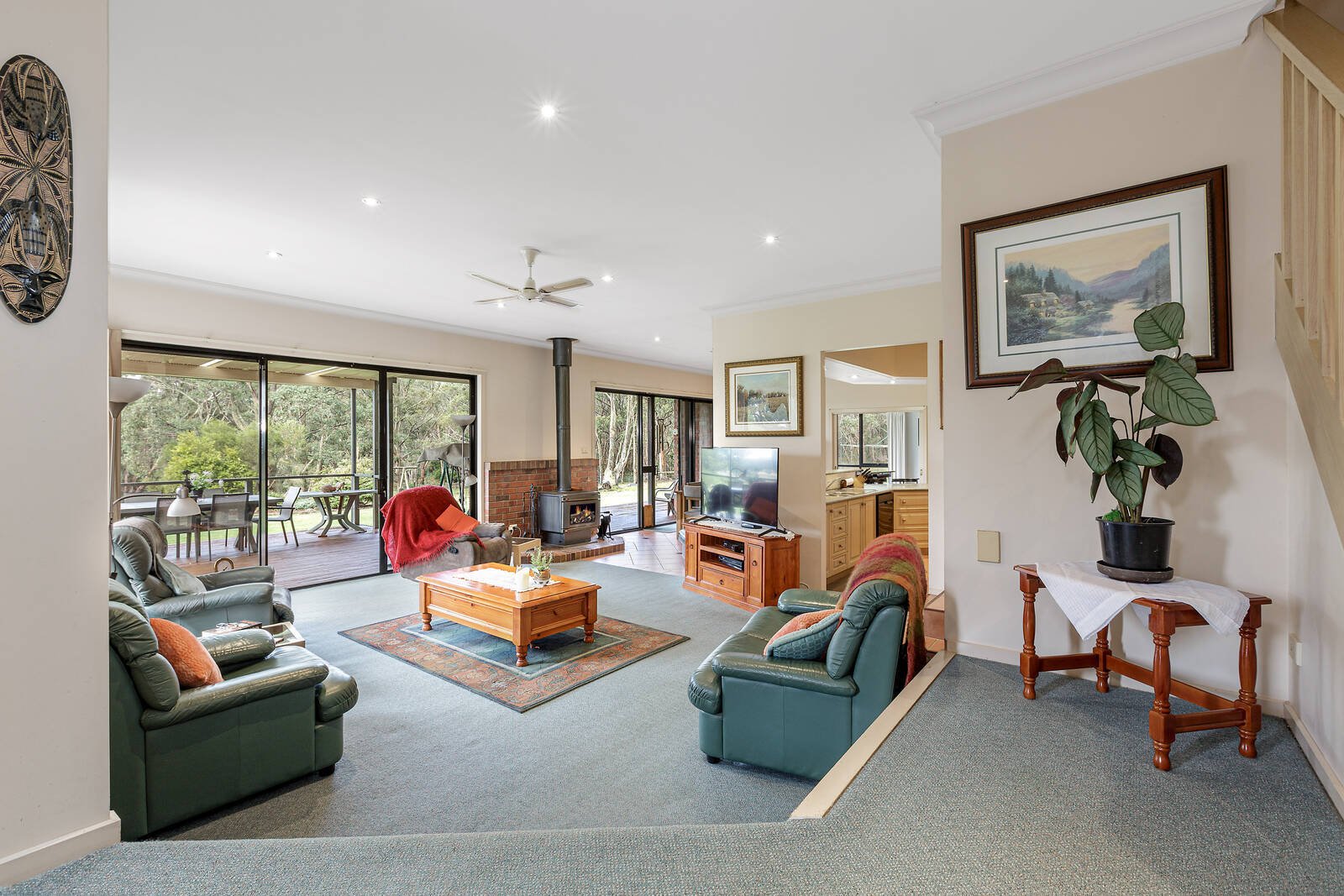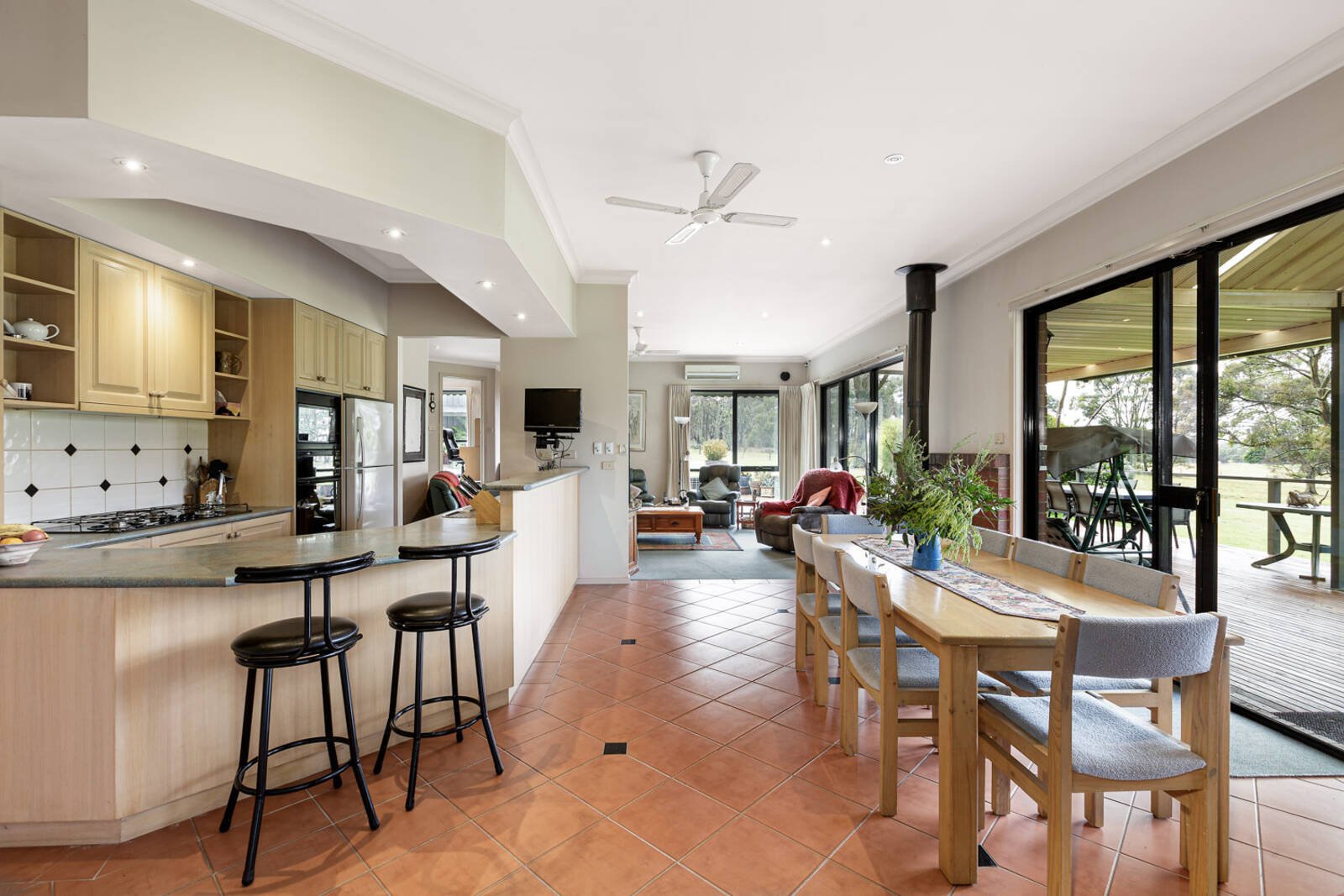 The large open plan living area sits high on the land and faces the East to take advantage of the beautiful dams and bush setting. The kitchen is well appointed with gas stove, electric oven and dishwasher. There is a walk-in pantry with a sink and fridge space.