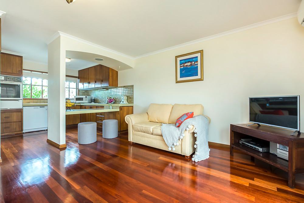 The open plan kitchen and living area is of great size and is illuminated by natural light from the abundance of windows that surround which makes the most of the north facing aspect. A beautiful space to relax with family and friends. The stylish kitchen has plenty of cupboard and bench space and also boasts and a near new dishwasher. Centrally located in this living space is the reverse cycling heating and cooling unit which ensures all weather comfort inside.