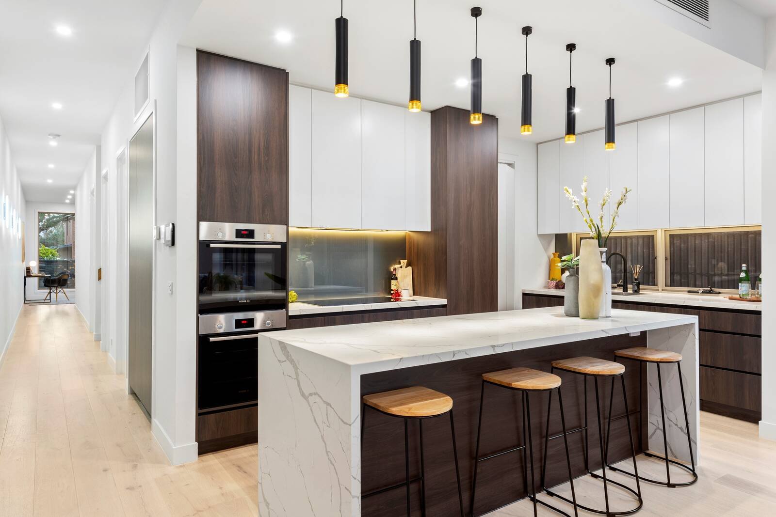 The luxurious kitchen serves in style and is finished with stone surfaces, Bosch appliances (induction cooktop), WIP and island bench with beautiful pendant lighting.