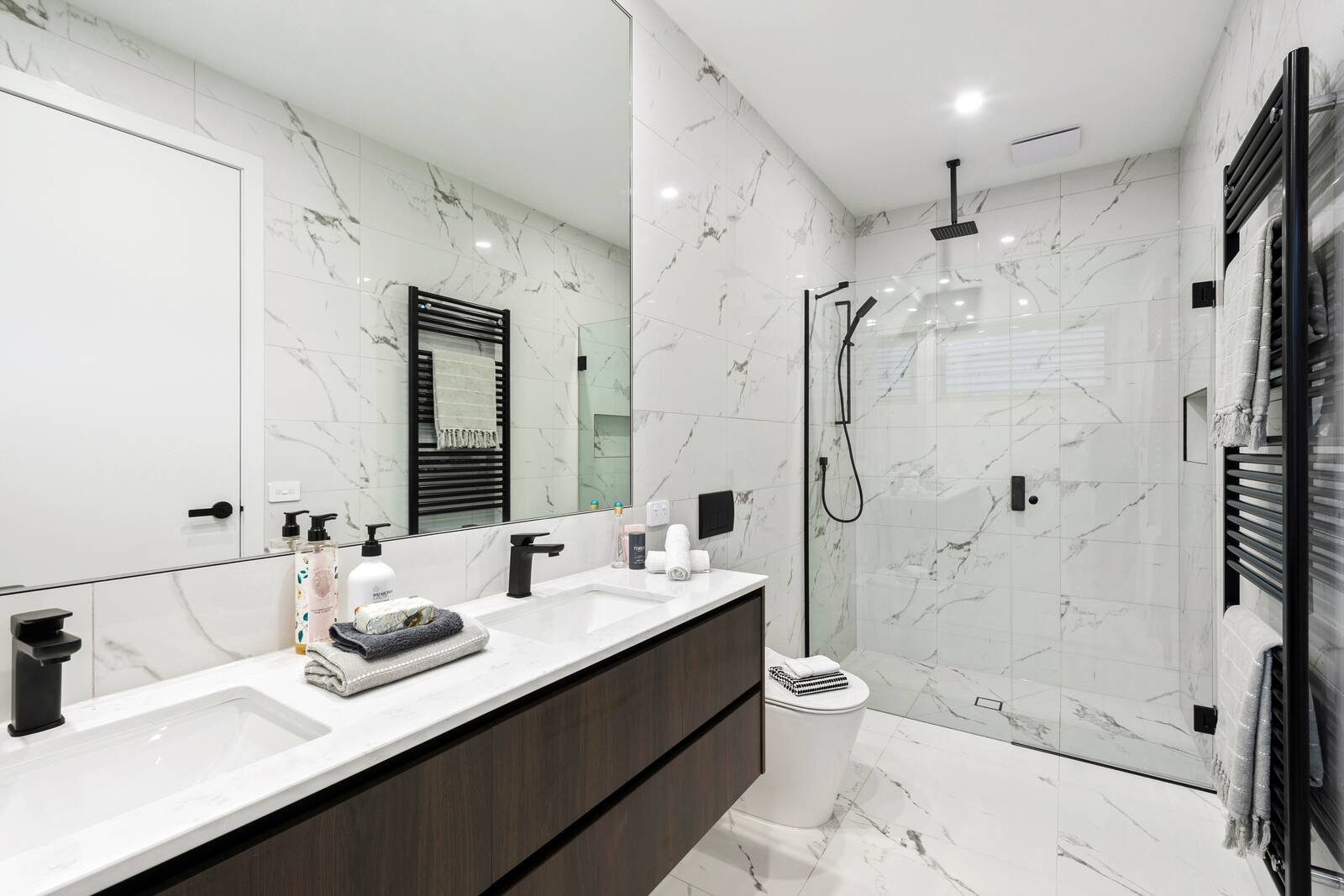 A ground floor main bedroom featuring luxe fully-tiled ensuite with designer matte black tapware and WIR emphasise the versatility of vibrant dimensions, accompanied on the upper-level by teenage retreat with electric fireplace, 3 additional bedrooms, each with a WIR, second main bedroom with twin ensuite plus striking dual-vanity bathroom.