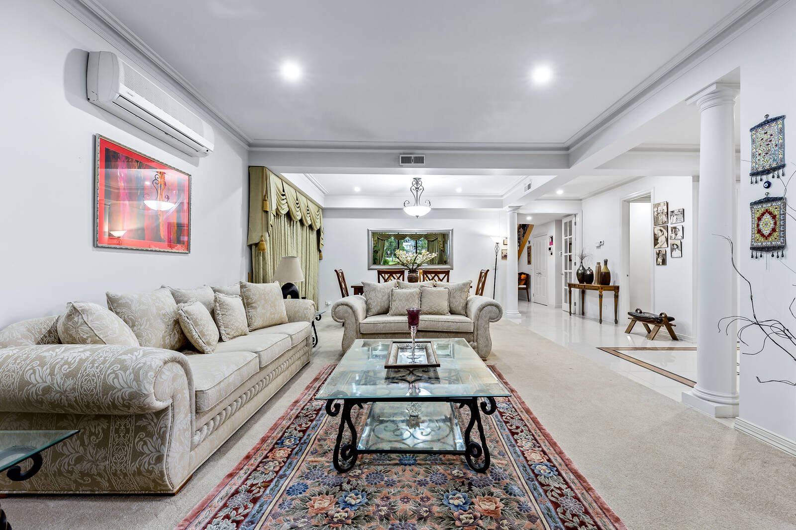 The striking contemporary facade and elongated driveway provide this stately two-storey home with magnificent first impressions. Double doors lead to a formal lounge/dining area plus a reception hall, which comprises the first half of the ground floor domain. Here, porcelain tiles and distinguished pillars are, without a doubt, awe-inspiring whether entertaining on a vast scale for friends or intimately with the family for a Sunday dinner.