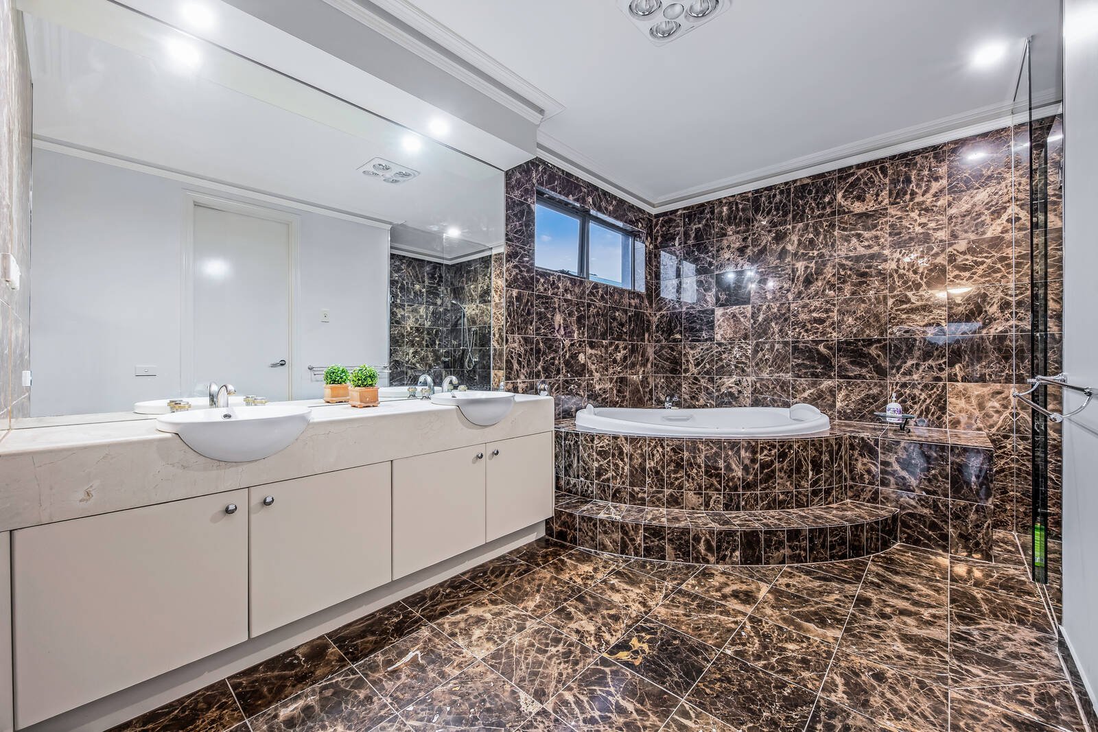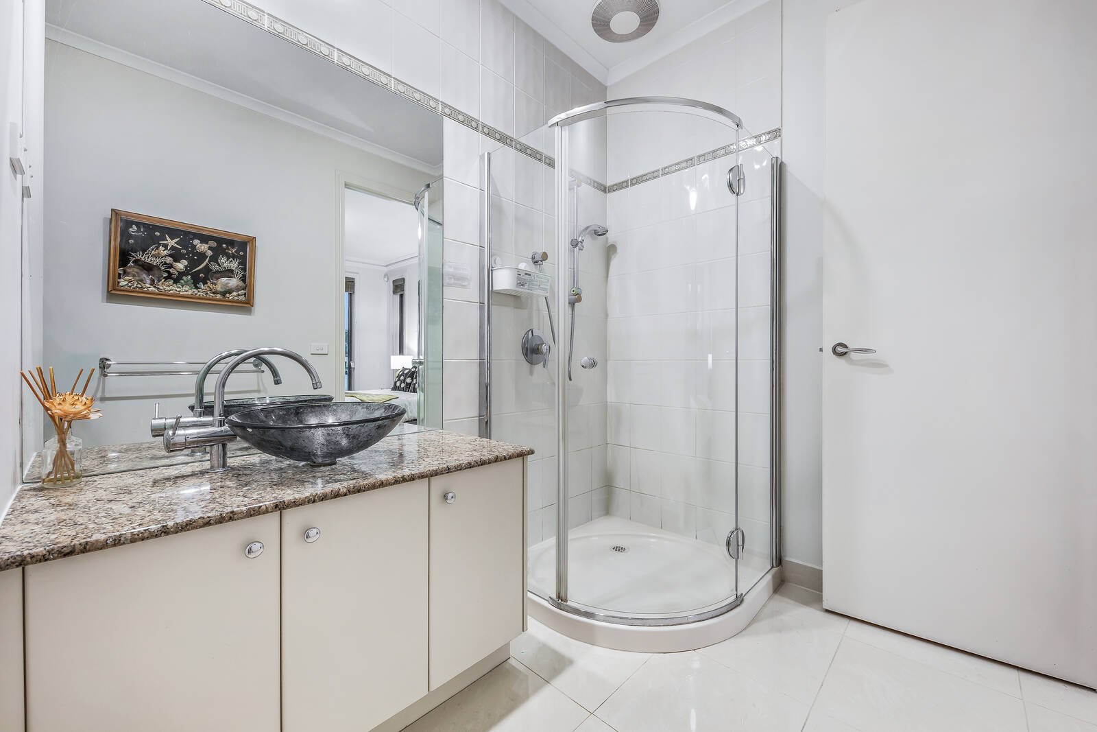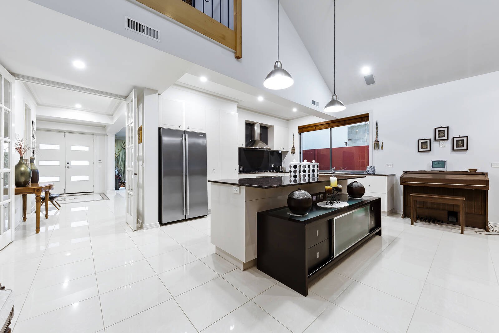 Walk under a soaring two-storey void, where comprehensive glass windows frame breathtaking views of the outdoor yard, to an open-plan living/dining area around a bespoke granite kitchen. The culinary space includes ample storage and timeless opaque cabinetry while flaunting a complete set of stainless-steel appliances, including a Smeg oven and a newly installed dishwasher. As we continue along, a rear retreat encompassing a fully equipped theatre room upholds exceptional standards of luxury, catering to private relaxation as well as vibrant entertaining.