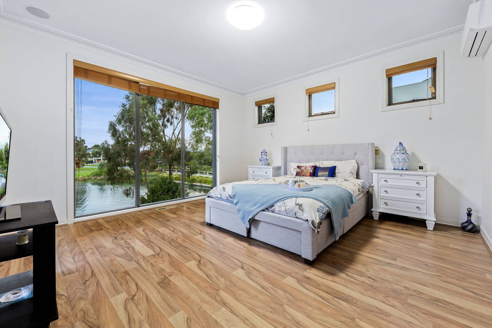 Inside, ascending the sweeping timber and iron wrought staircase, three spacious bedrooms, all with built-in robes, convene in an upstairs retreat, balancing lake views with privacy from the serene balcony. While a family-sized, two-way entry bathroom services these nearby bedrooms with a bath, separate powder room and WC. The extravagant main suite features two walk-in robes and an opulent hotel-inspired spa-ensuite encased in marble with dual vanity. Furthermore, guests or extended family can indulge in an independent ground-level bedroom with verdant views of the lake, complemented by a full ground-floor bathroom and a separate WC.