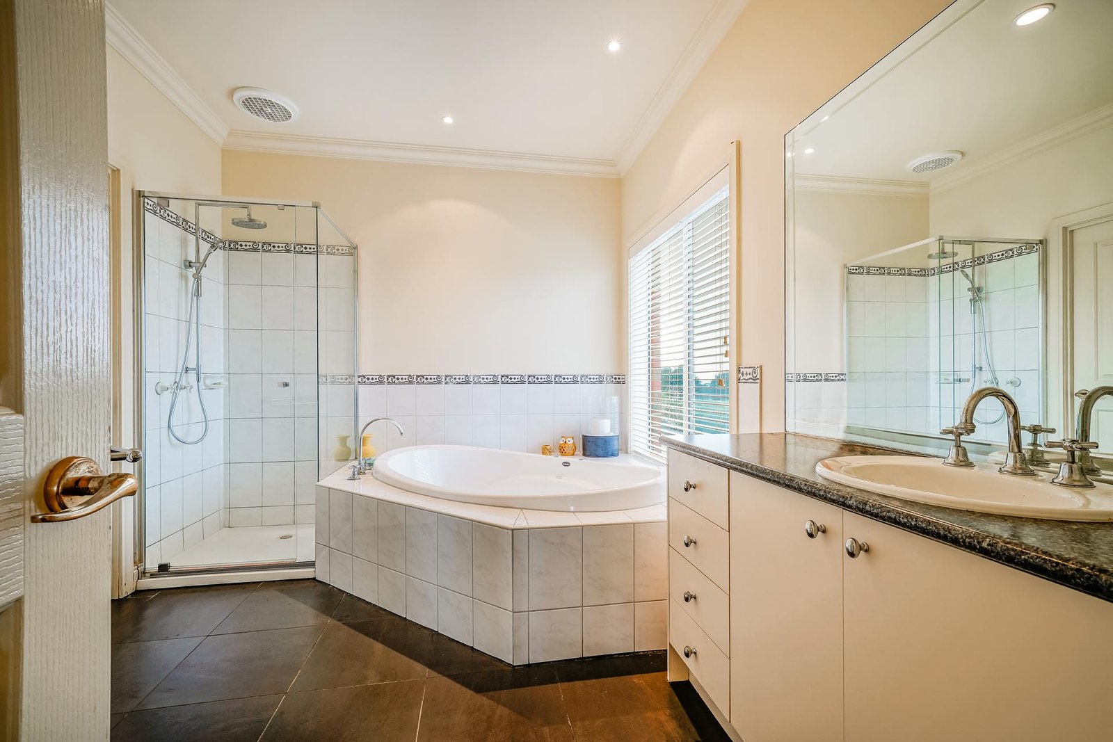 - Upstairs is the master suite with a walk-in robe, ceiling fan and ensuite with spa, shower and separate toilet