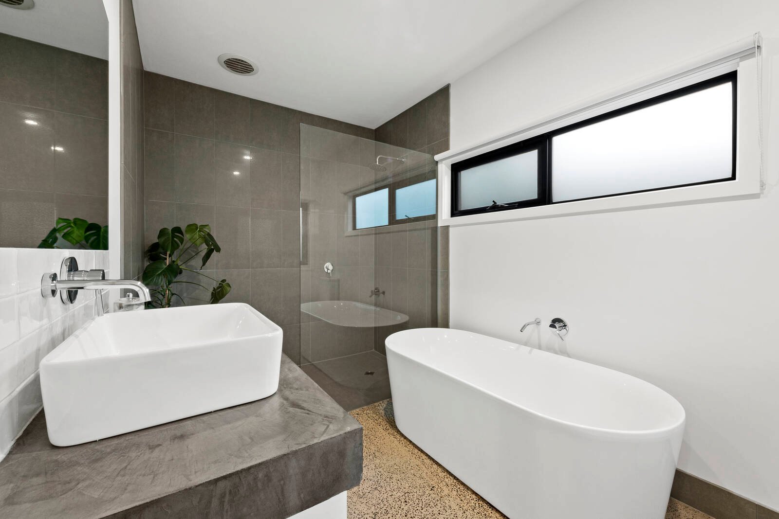 The main bedroom features a walk-in robe and a luxurious ensuite with concrete benchtops to the double vanity and an oversized shower. Two further bedrooms include built-in robes, and the main bathroom features a free-standing bathtub and a large shower. Extra features include a home office, spacious laundry, abundant storage and a separate powder room.