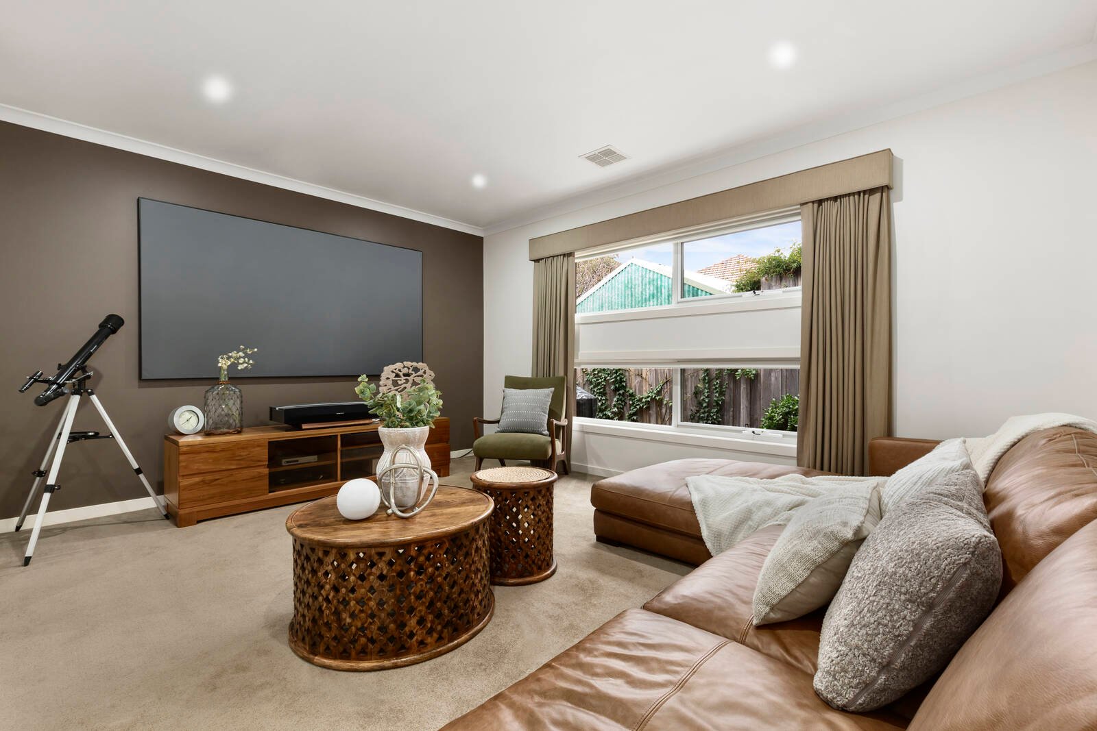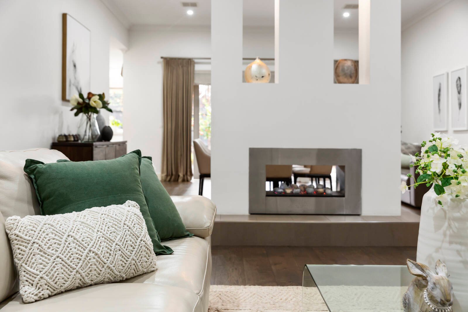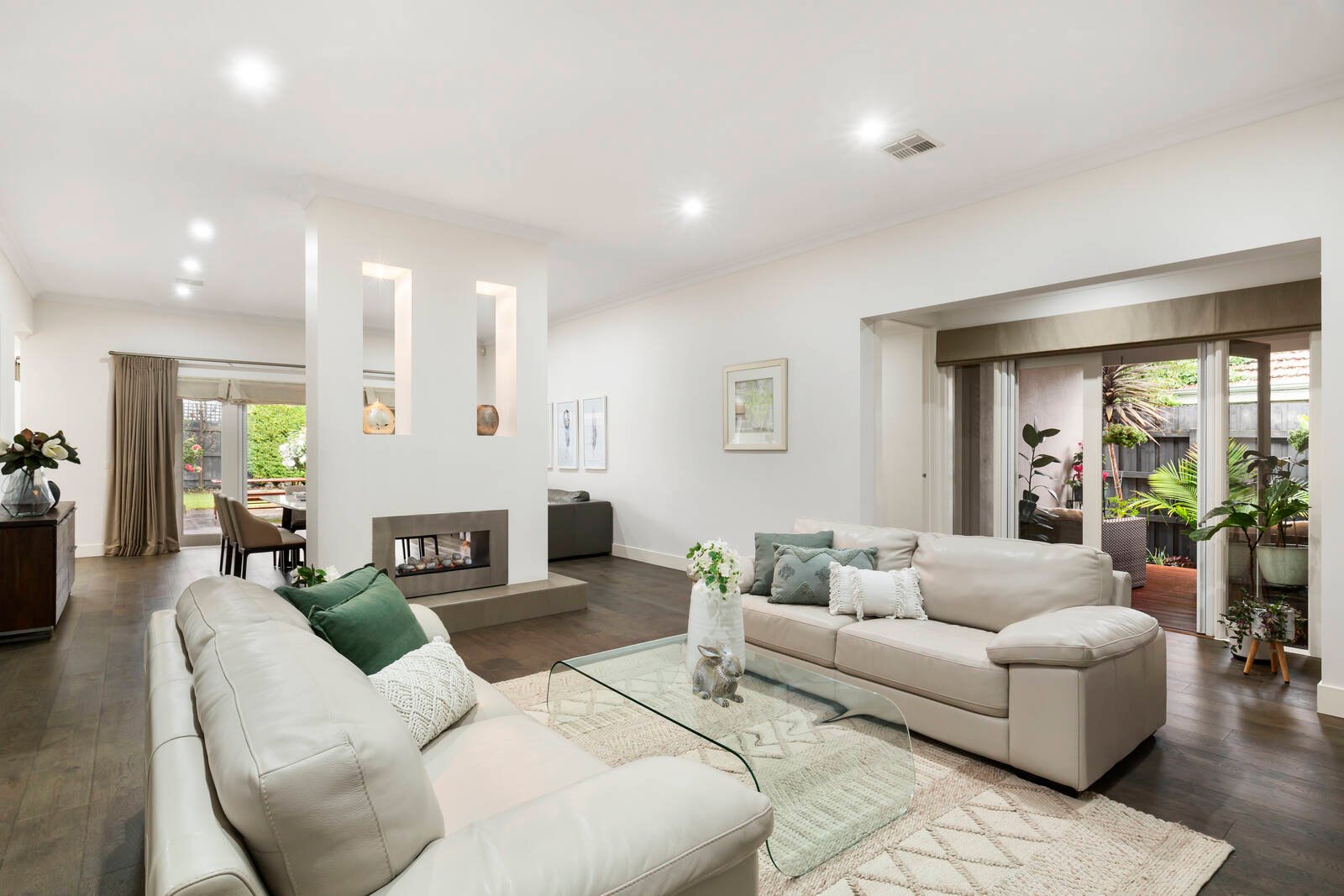 With a feature fireplace acting as a divider in the open plan living area, and the addition of a home cinema, butler’s pantry, and lavish parent’s retreat with ensuite, this is a home that celebrates easy living with a sense of style. French doors highlight the indoor-outdoor integration, with plenty of deck space framing the west facing rear garden.