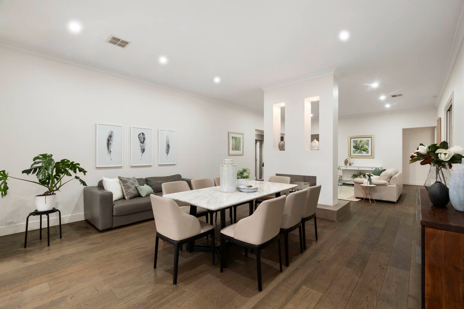 Beyond the dramatic high roofed portico entrance, the rendered façade unveils stylish single level living, uniquely designed with abundant living space as its centrepiece, and bedrooms zoned to encourage complete retreat in the outer wings.