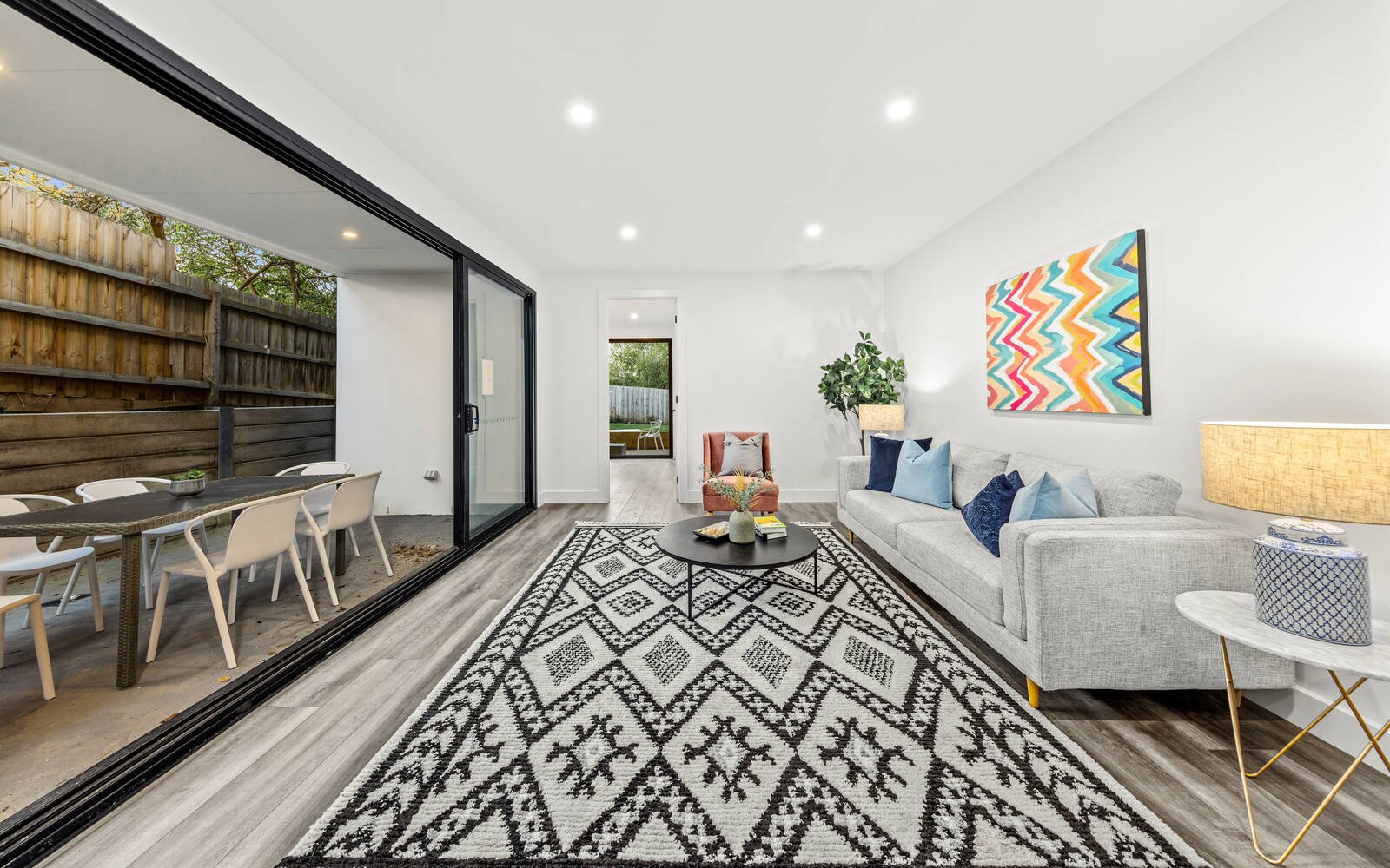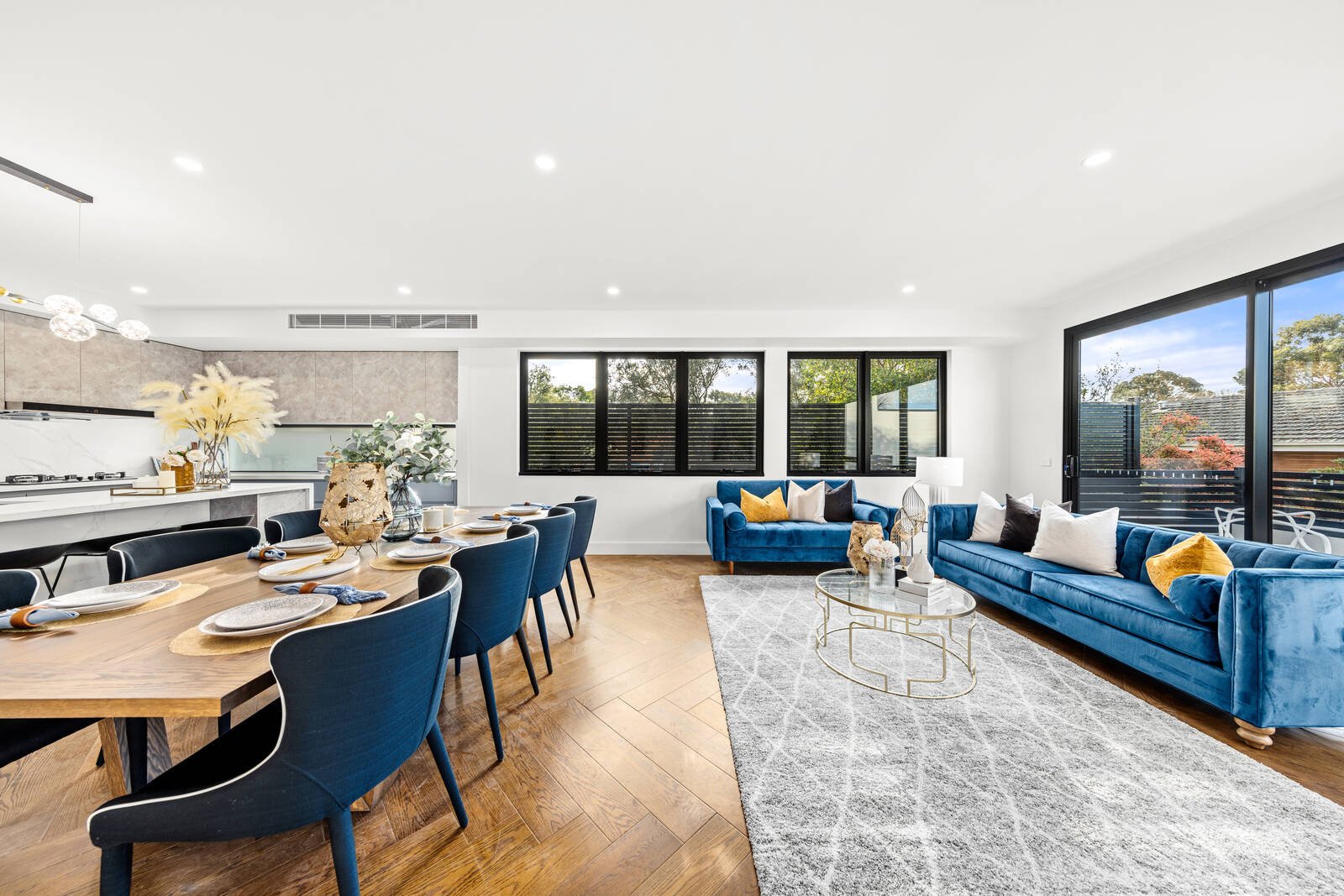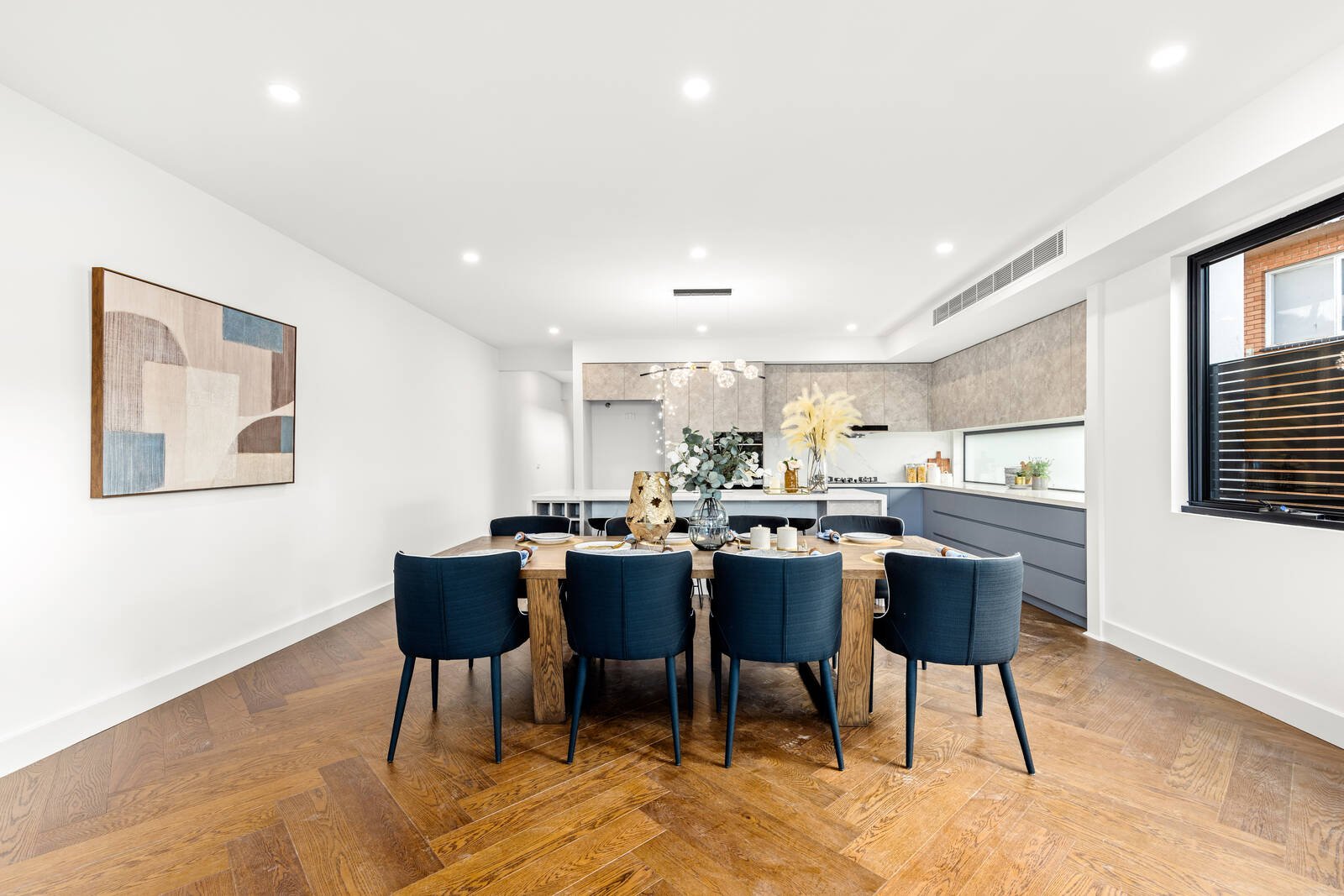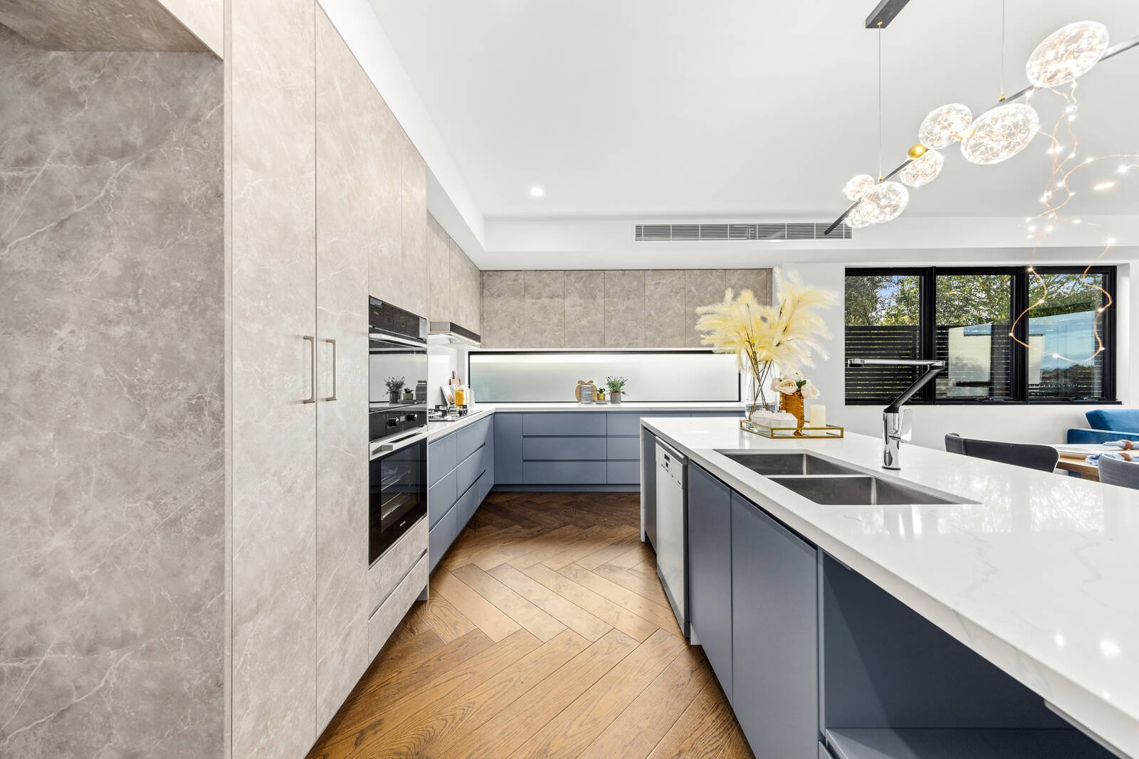 Beautifully-appointed throughout with high ceilings, designer lighting and tapware, herringbone parquetry flooring, plush carpets, full climate control, video intercom, generous storage, a guest powder room and an auto double garage with internal and rear garden access.