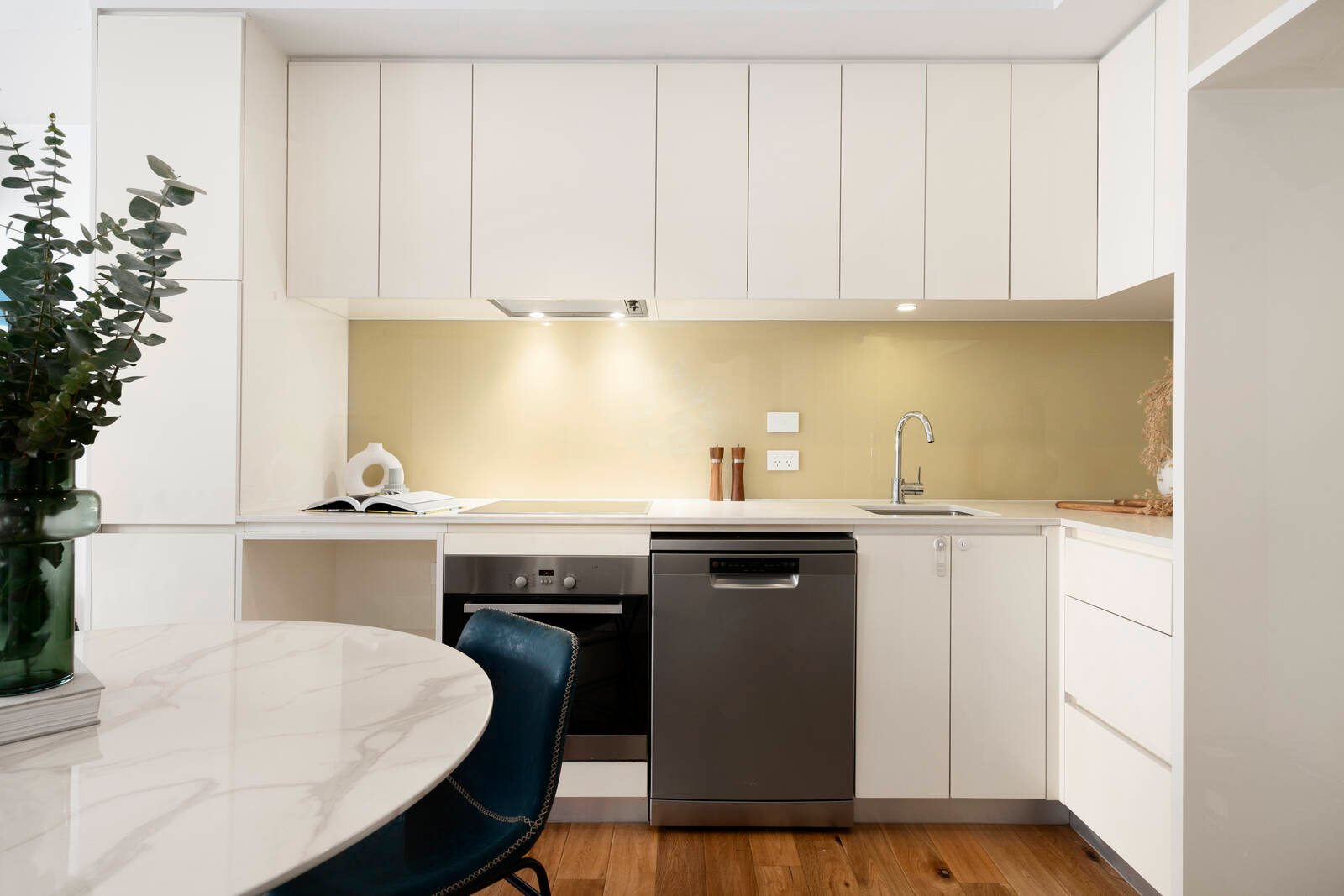Spacious open plan living and dining areas feature an integrated Miele kitchen whilst two bright bedrooms include floor to ceiling mirrored BIRs with storage, the main with a clever study nook. Other highlights include a chic designer bathroom with excellent storage and laundry taps, stone finishes, timber floors, split heating/cooling, intercom security, lift access from a smart entry foyer and basement parking.