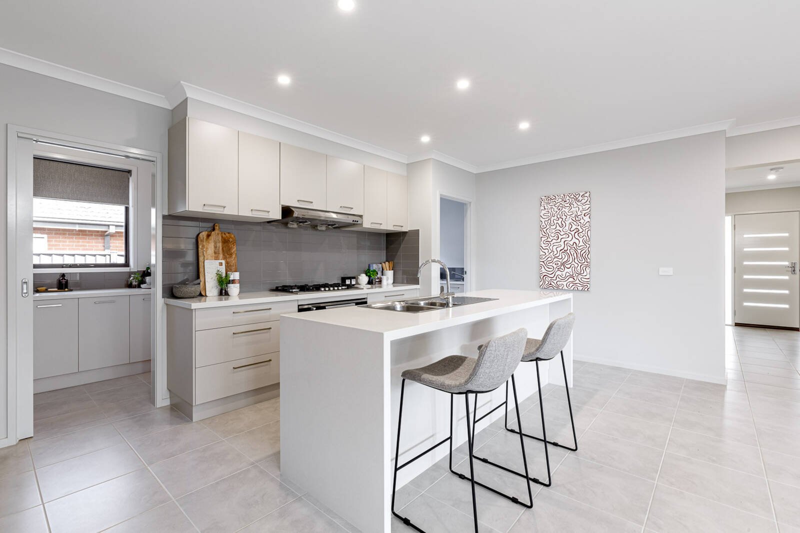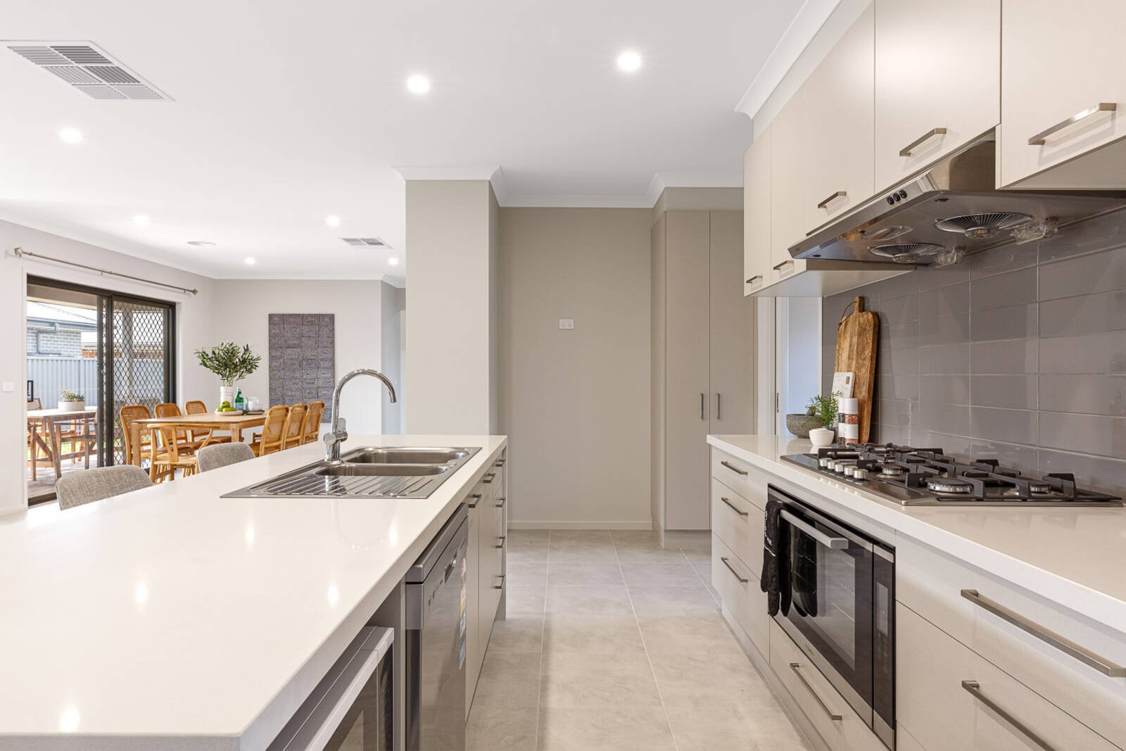 There are two separated living areas and the kitchen is modern with stainless steel appliances, island bench cover in stone and a separate butler’s pantry and a laundry to the opposite end of the kitchen.