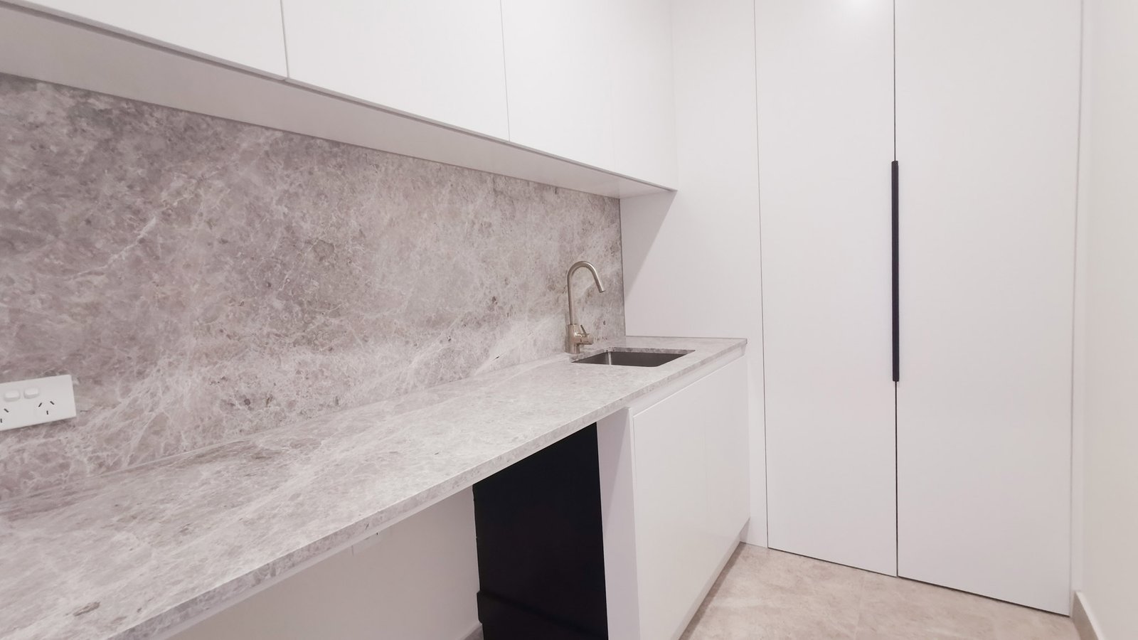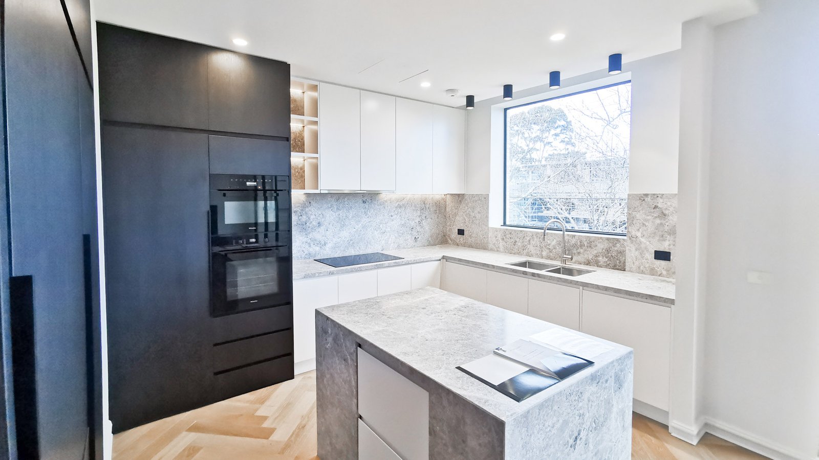 * All-new kitchen showcasing an island bench, marble surfaces, Miele appliances including two ovens and an induction cooktop, an integrated Fisher and Paykel dishwasher and fridge/freezer