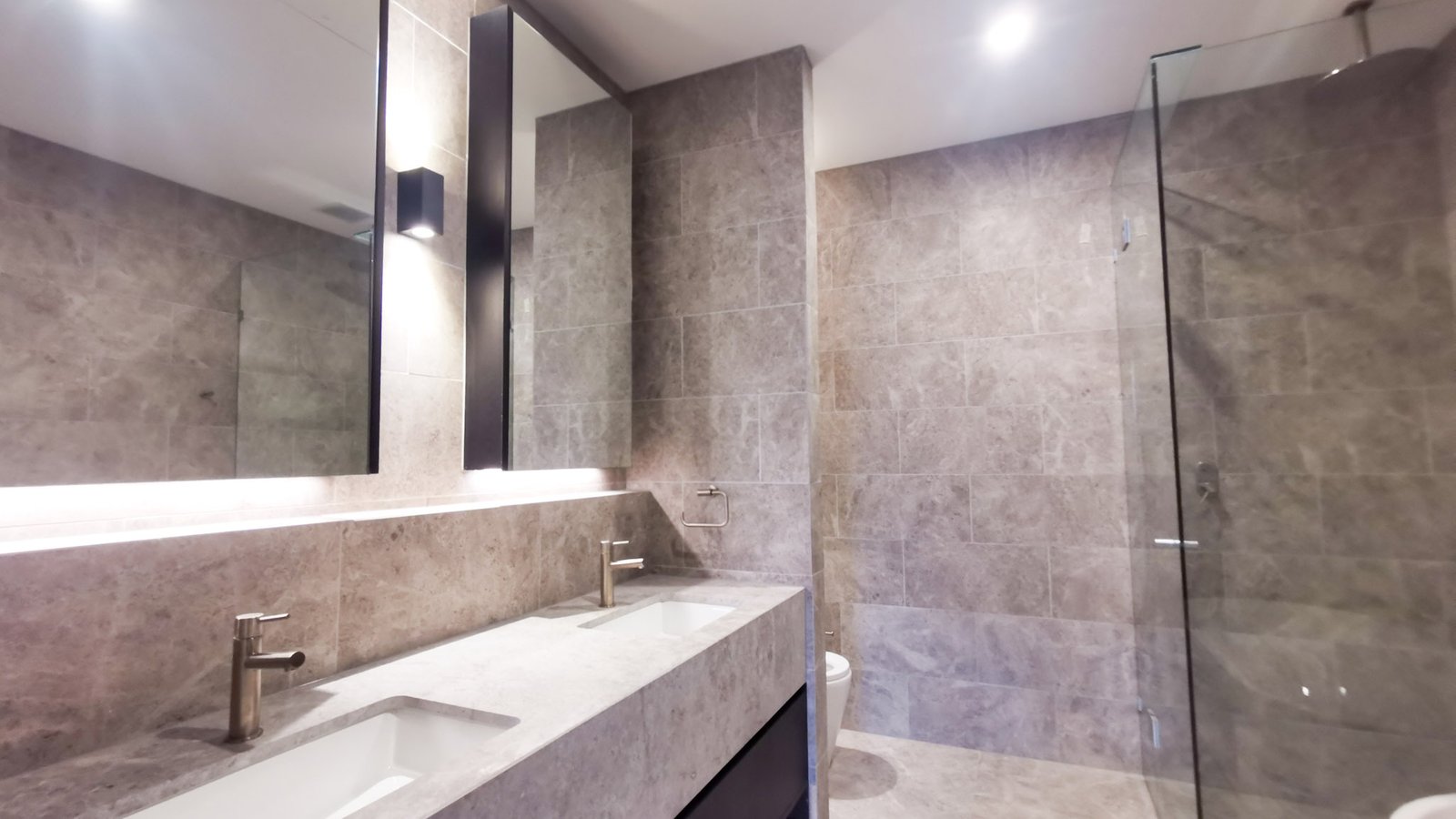 * Luxurious twin-vanity bathroom featuring a freestanding bath, Milano tapware, floor-to-ceiling tiles and a rainfall/hand-held shower