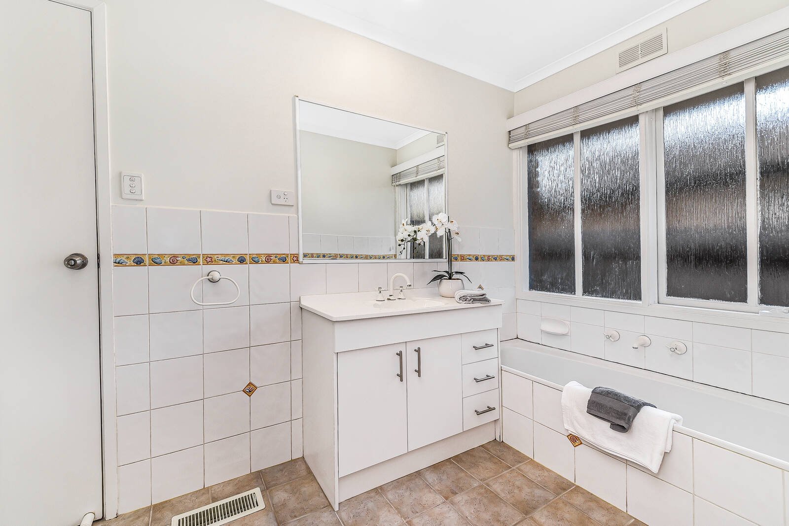 Three well-sized bedrooms enjoy built-in robe storage and are serviced by a central bathroom offering a tiled hob bathtub, opaque windows, mid-height wall tiles with ocean-themed flourishes and an original vanity unit with spindle tap ware. The bedrooms and rest of home are kept comfortable via ducted heating.
