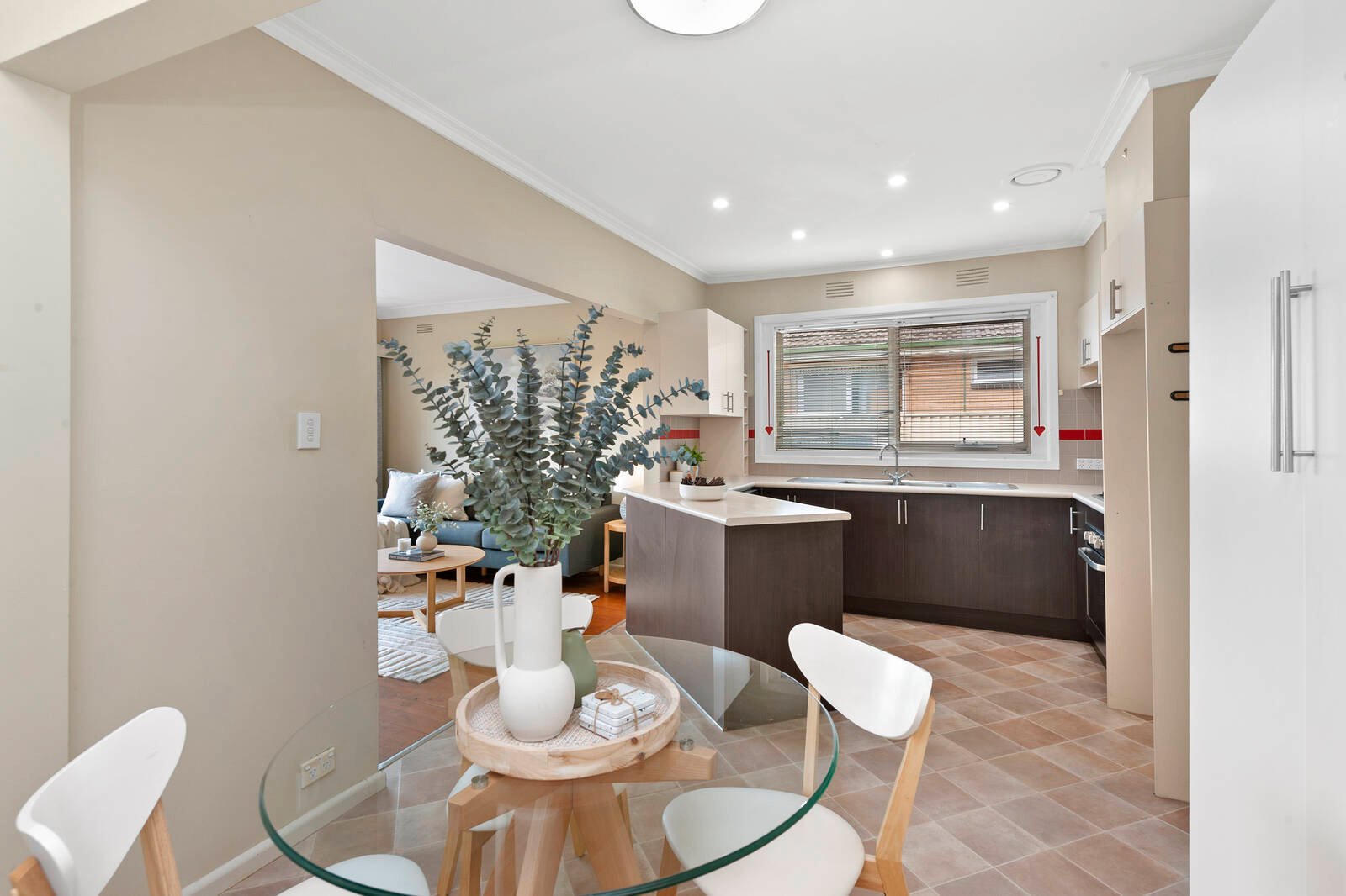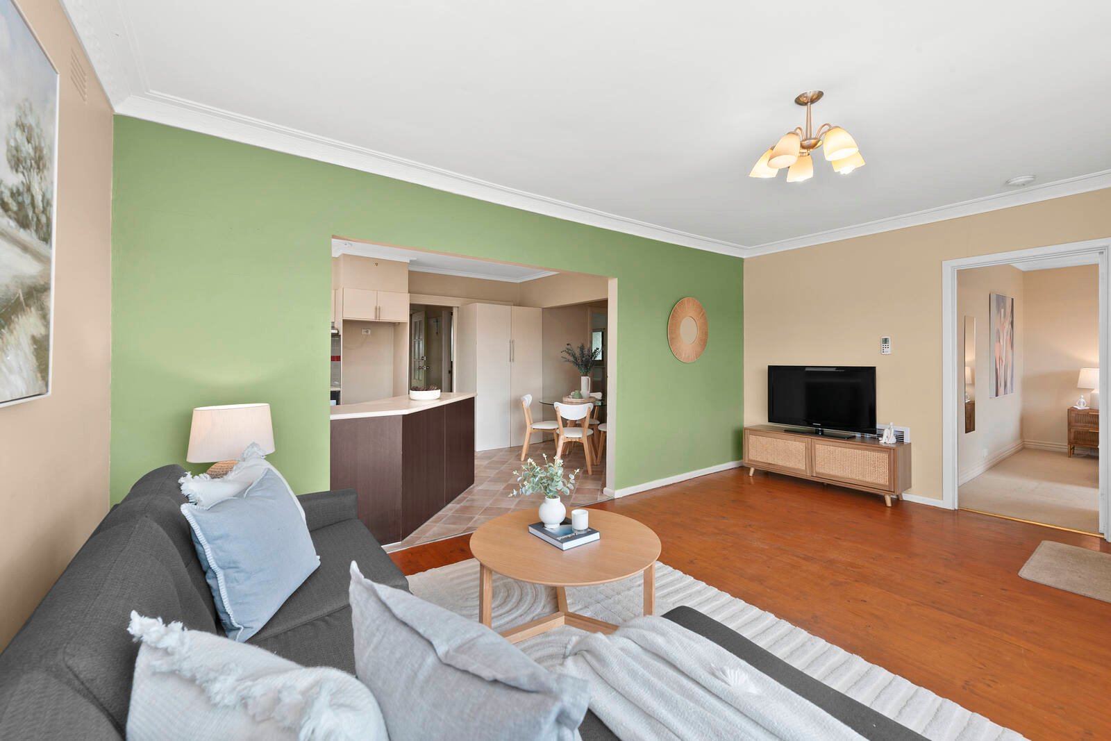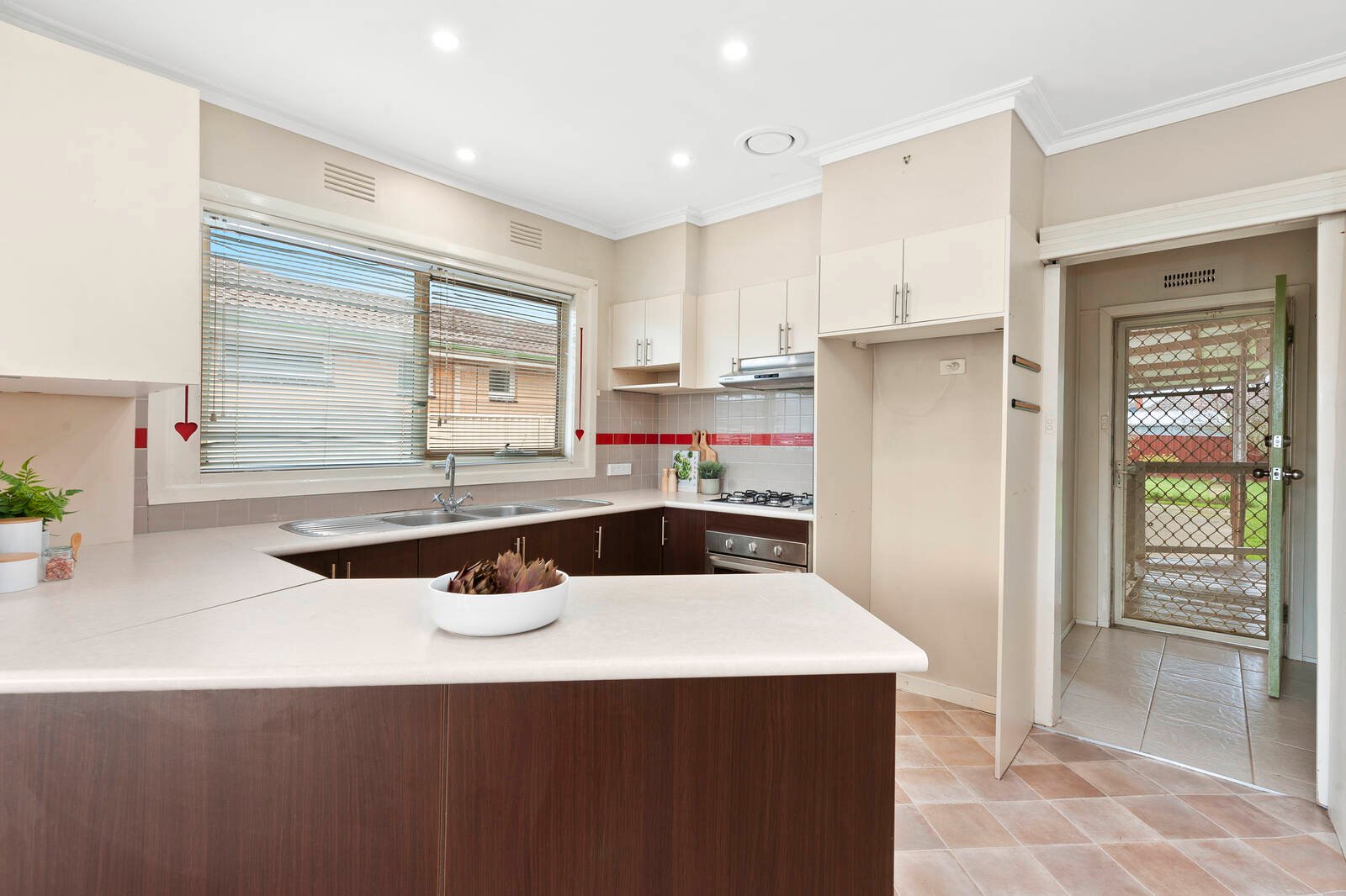 The north-facing living area allows a flood of natural light to flow through to the open-plan kitchen meals room. The kitchen provides ample cupboard and bench space and modern appliances including a dishwasher