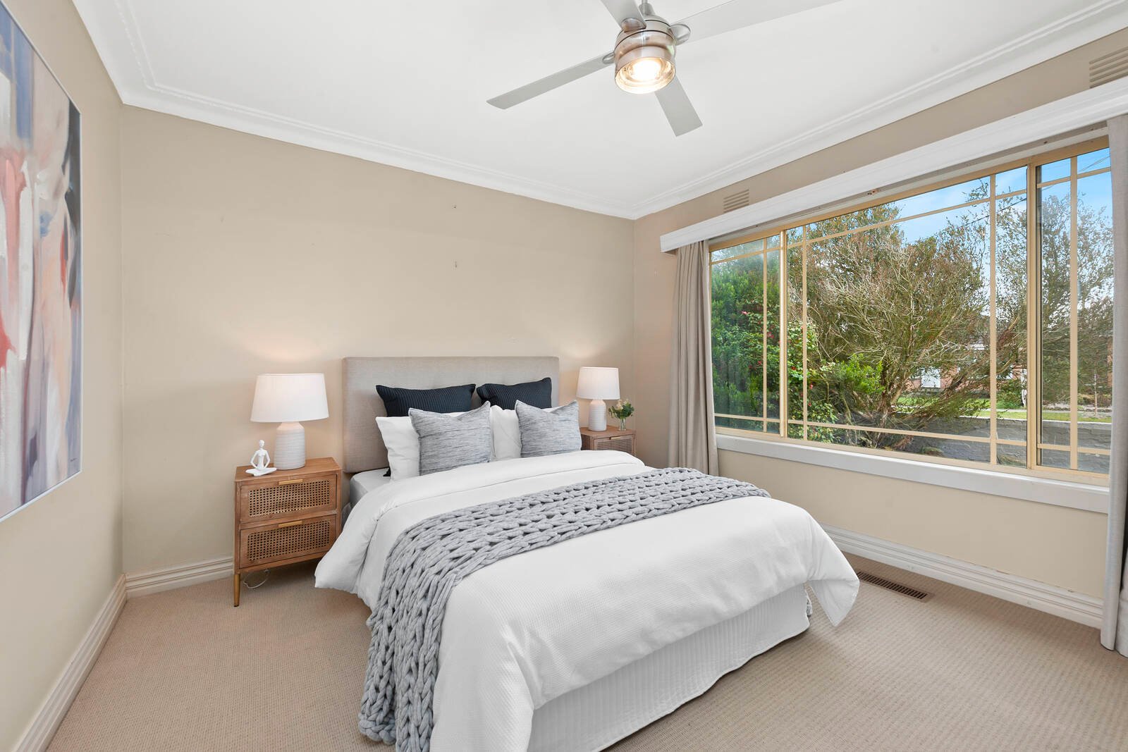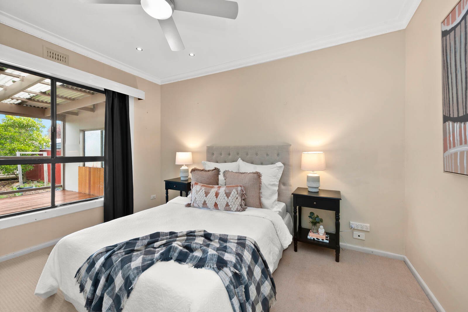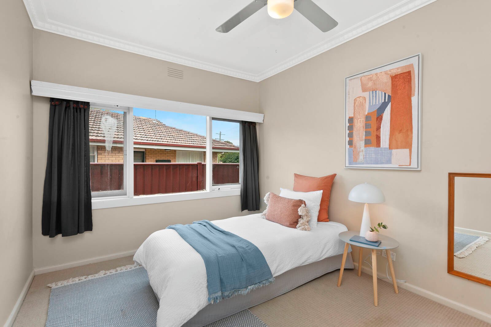 The north-facing living area allows a flood of natural light to flow through to the open-plan kitchen meals room. The kitchen provides ample cupboard and bench space and modern appliances including a dishwasher