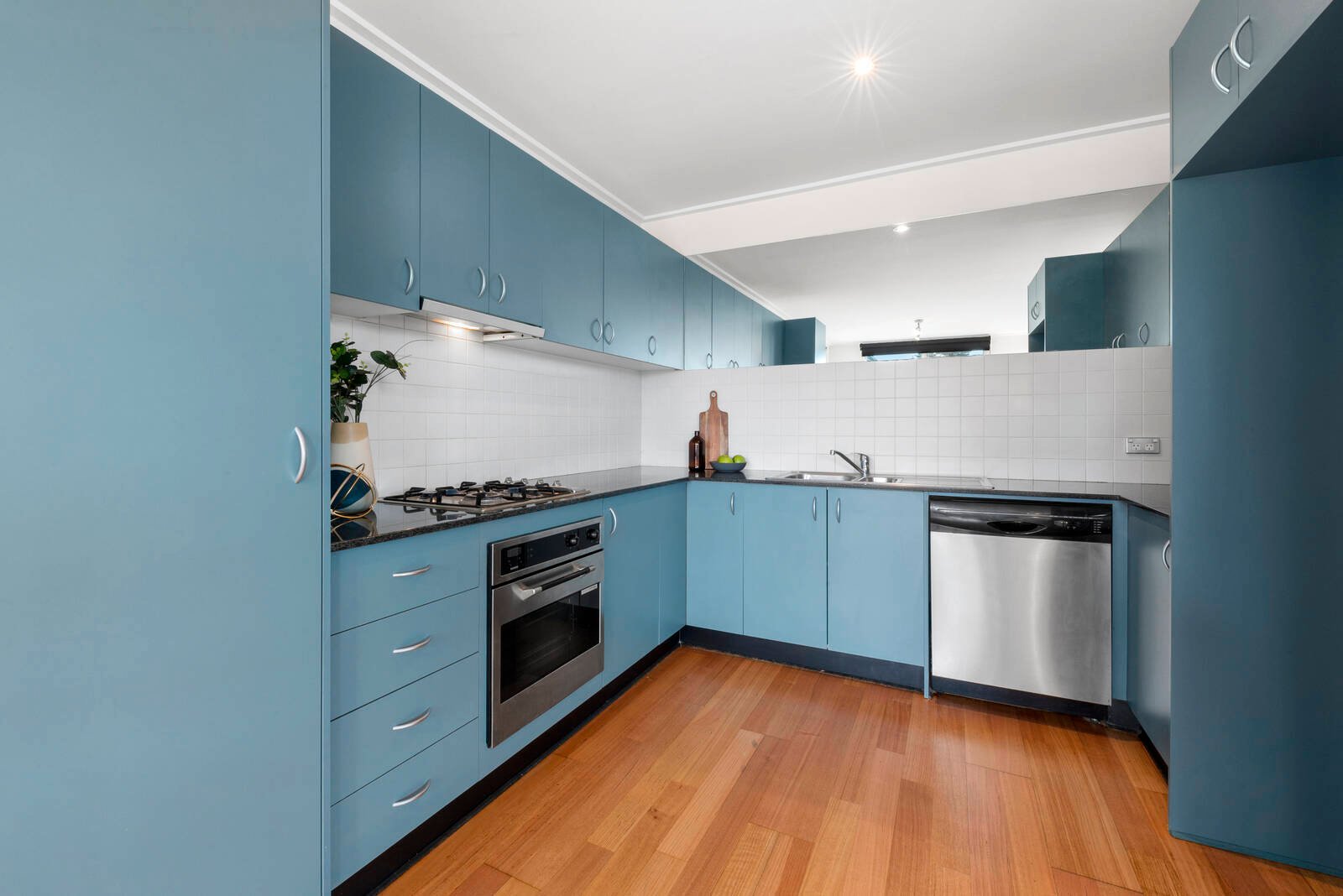 On entry to the apartment, north-facing windows stream in beautiful natural light, combining with crisp white interiors to create a warm and welcoming ambience within. The open plan flows easily from the living and dining to the kitchen creating a fantastic space for everyday living and entertaining set against a picturesque backdrop. The well-equipped kitchen features modern cabinetry, quality Blanco appliances, excellent storage and bench space, and is well-positioned to enjoy the views. The living opens up to a private balcony providing the perfect space to enjoy your morning coffee or evening wine whilst taking in the vibrant atmosphere of the Waterfront.