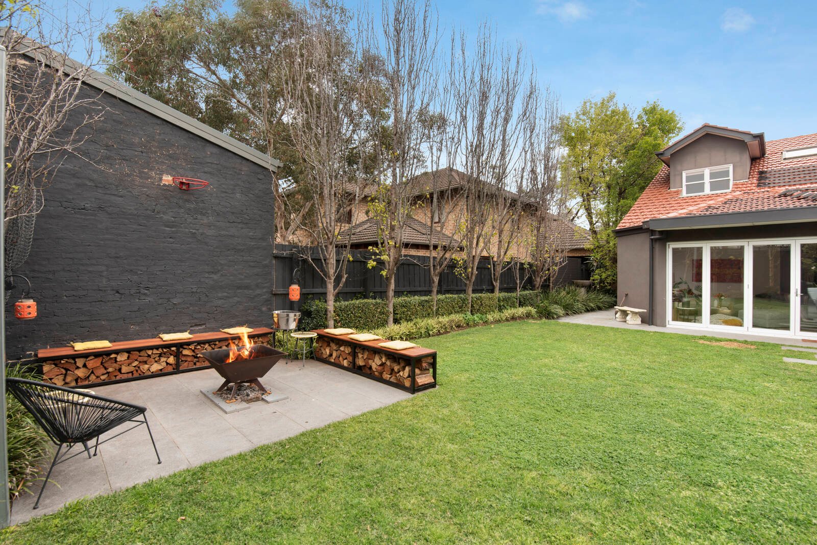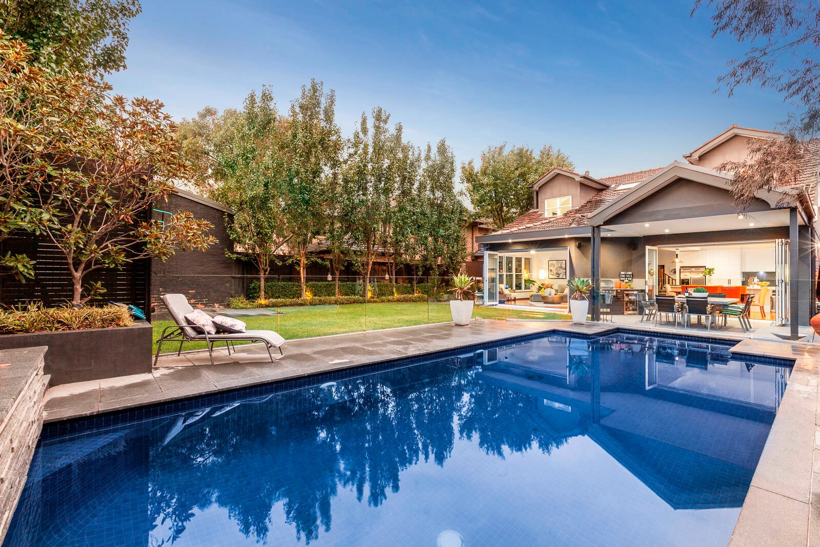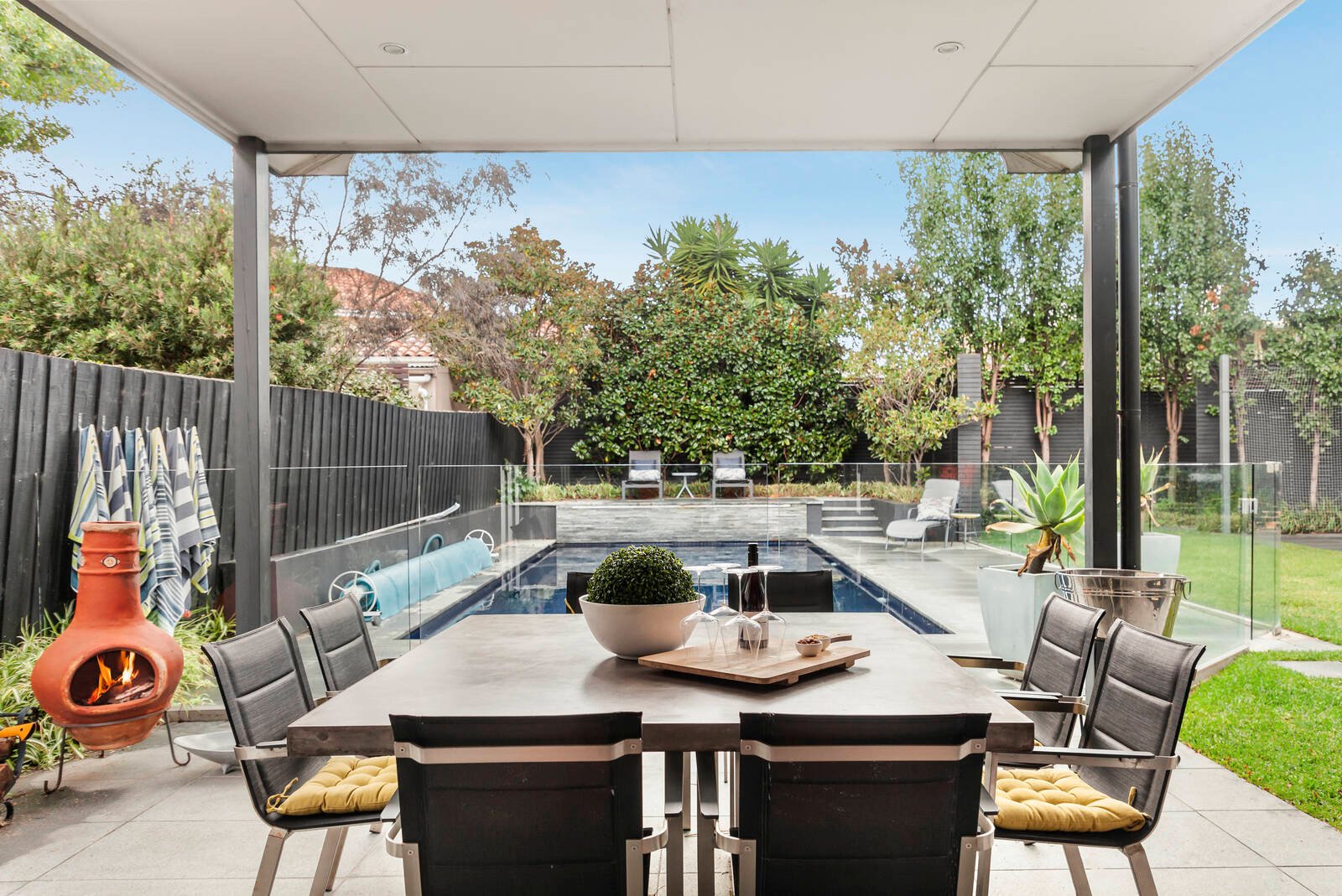 The family area is positioned to take in uninterrupted views of the back garden so that parents can easily keep an eye on the kids in the solar and gas heated pool and spa while they play. A paved area integrated into the garden allows for ball play during the day and enjoying a glass of wine and toasted marshmallows around the fire pit at night.