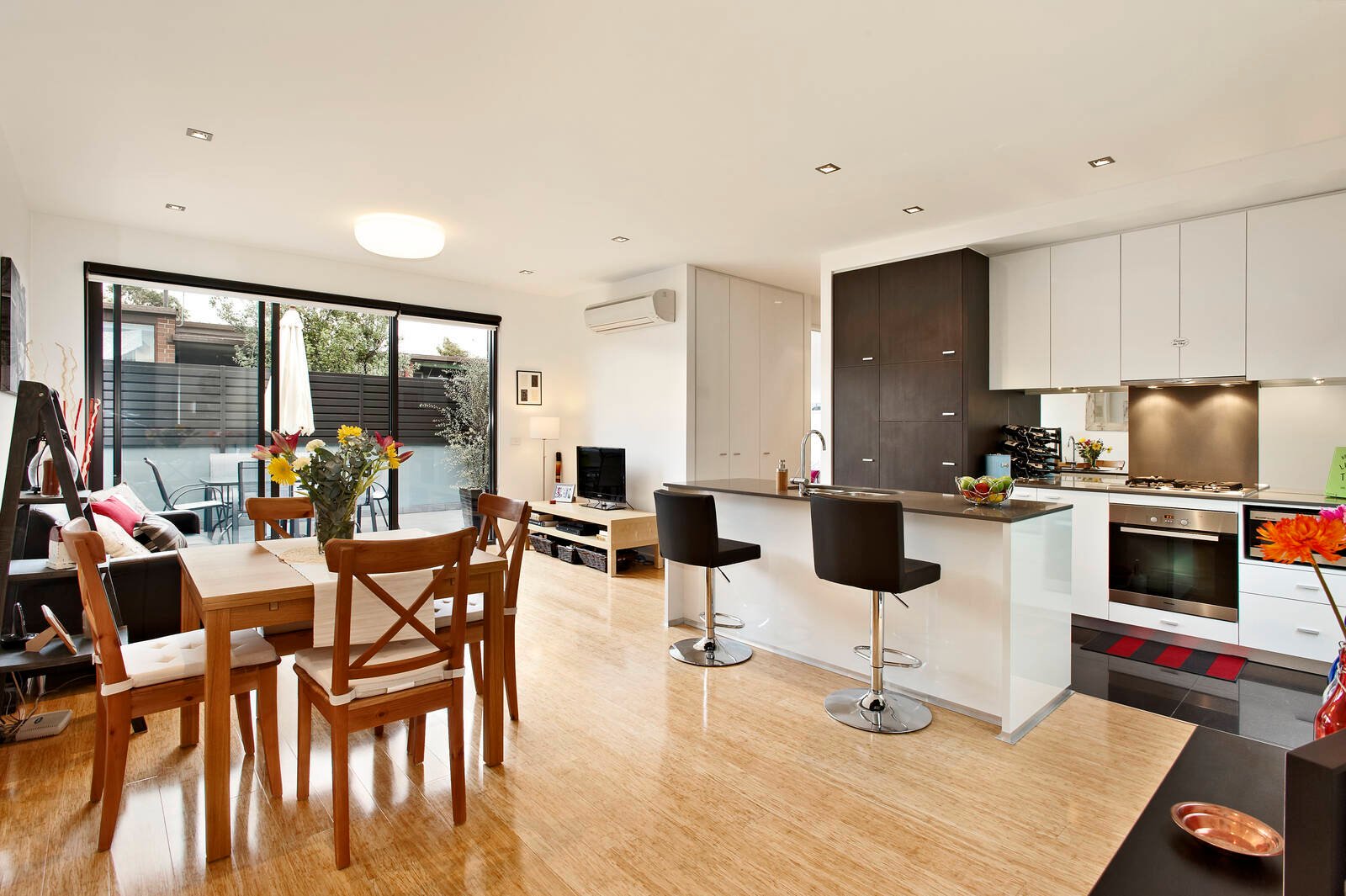 Light filled living/dining zones are framed by front and rear outdoor spaces, bamboo floors and a quality open-plan Miele kitchen with island bench, integrated fridge, dishwasher and gas cooking.