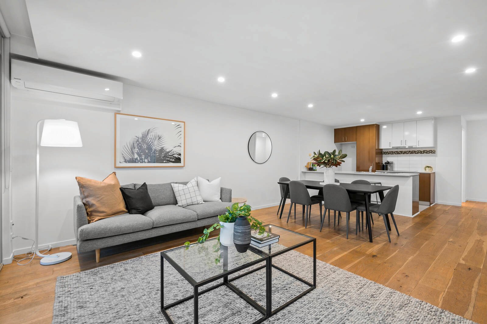 Large elevated open living is bathed in natural light, highlighting chic white décor and the warmth of wide honeyed flooring with glass sliding doors that connect to the expansive balcony for alfresco entertaining. The gourmet kitchen will inspire stylish soirees and latte chats from its stone breakfast bar, with the bonus of a new oven, induction cooktop, dishwasher and contrasting white and timber-toned cabinetry. Accommodation includes two bedrooms, one with balcony outlooks and built-in robes, the master comprising a walk-in robe and ensuite.