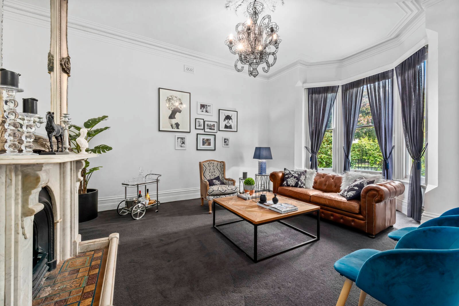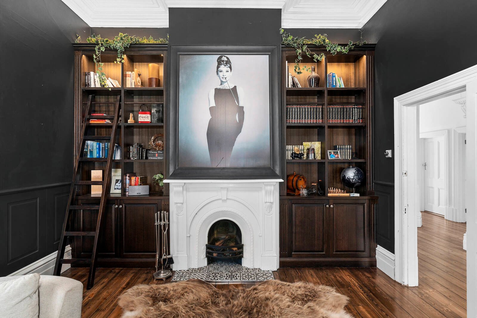 Manicured gardens and a spectacular character façade greet you on arrival. Stepping inside, a wide entry hall, soaring 3.6m ceilings, original floorboards, ornate cornice and ceiling rose showcase the grand character of its era. A generous lounge off the entry features an original marble fireplace and beautiful bay window overlooking the architecturally landscaped gardens, providing a sophisticated space to entertain or relax. An adjacent library is equally impressive, featuring bespoke bookcases framing a marble fireplace, providing an ambient space that is versatile for use as a home office, additional living or fourth bedroom.