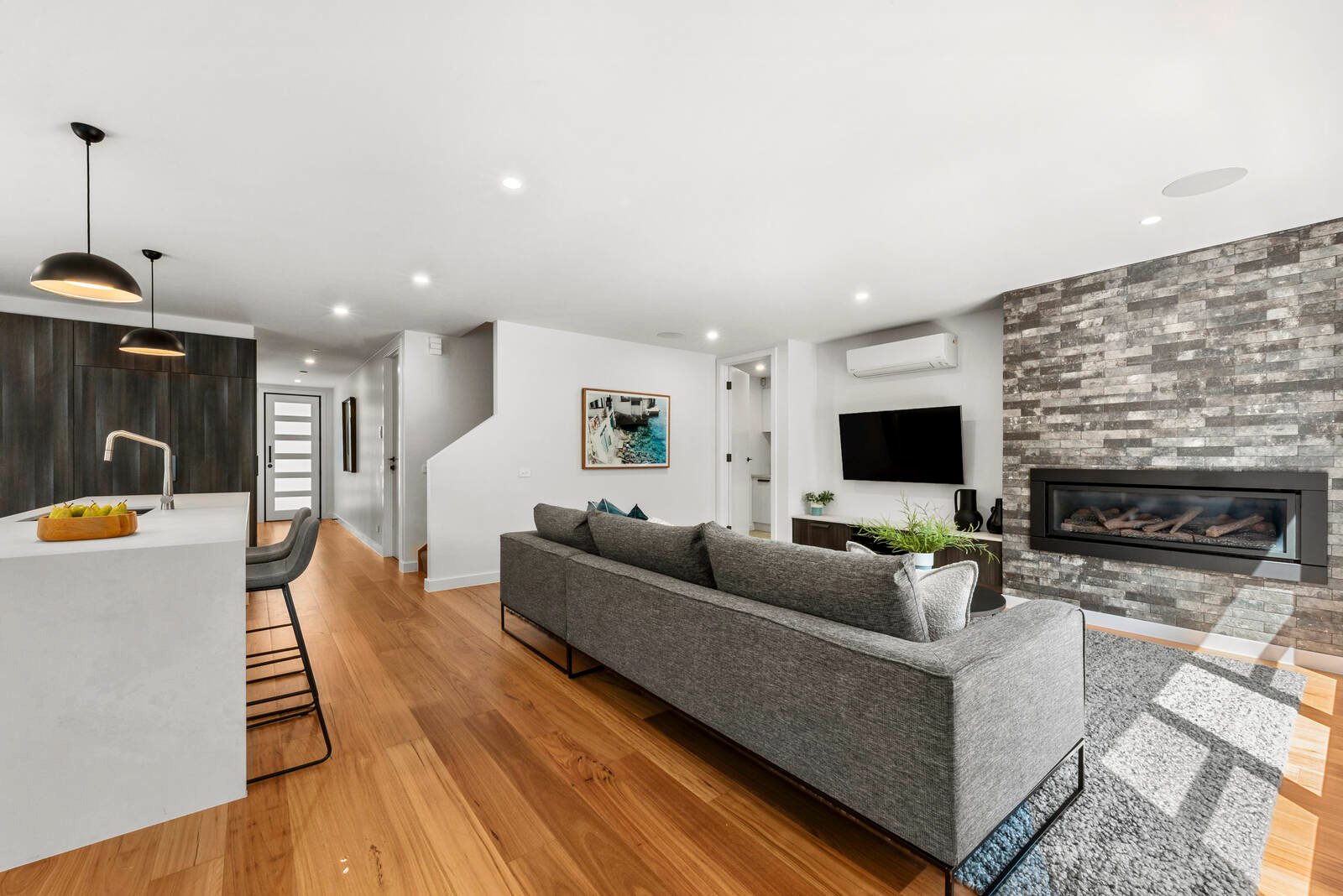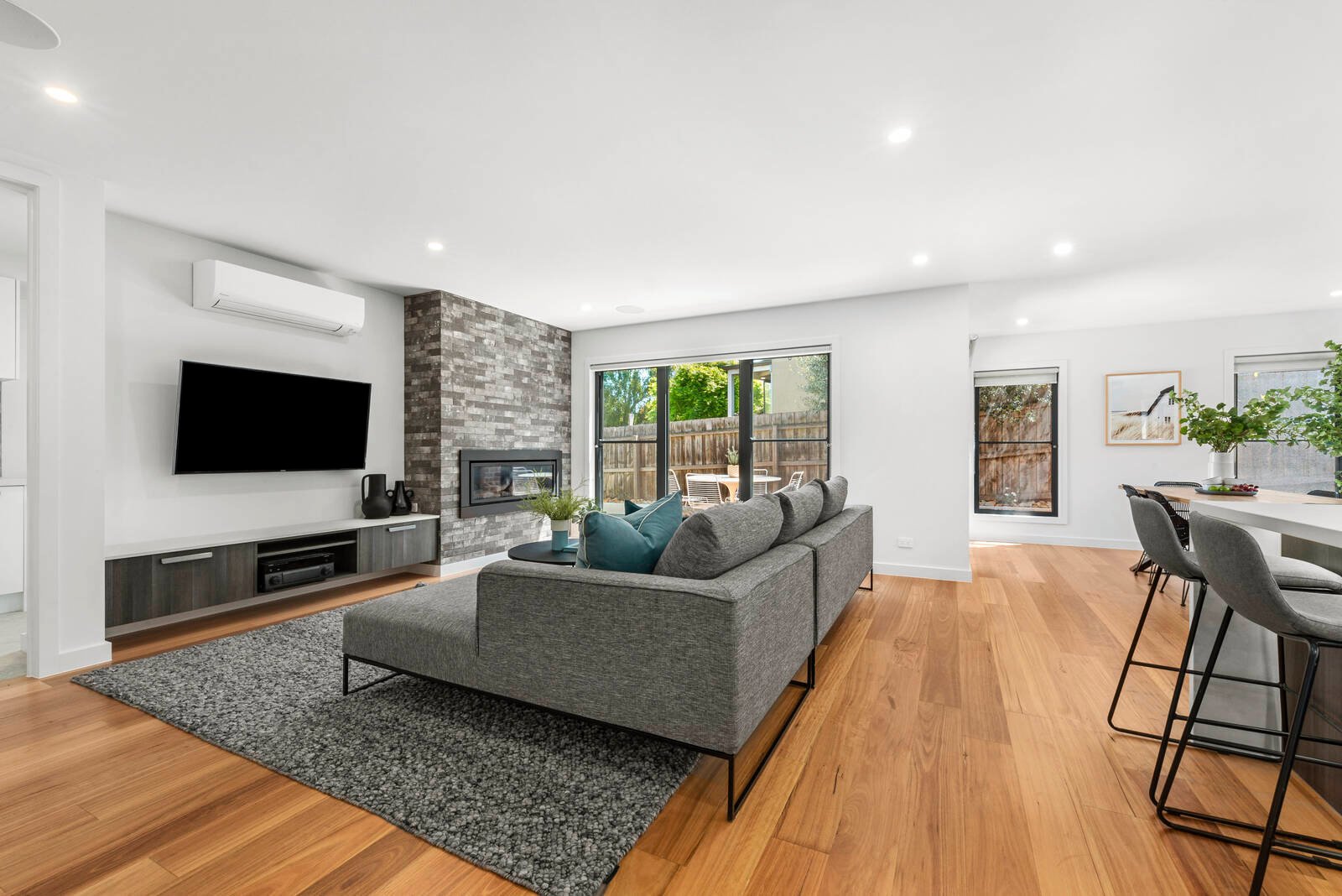 A central hallway leads through to the spacious open plan living area, featuring a high end entertainer’s kitchen with long island bench, waterfall Caesarstone bench tops in stunning Cloudburst Concrete, dual Siemens ovens and gas cook top, fully integrated Bosch dishwasher, fully integrated Liebherr fridge, quality cabinetry with ample storage, and is perfectly positioned to overlook the dining and rear deck for effortless entertaining. The living room showcases a brick feature wall with gas log fire, creating a warm and inviting ambience throughout this space. The dining area includes north-facing windows for excellent natural light and glass sliders opening up to a private sun deck offering an easy indoor/outdoor flow.