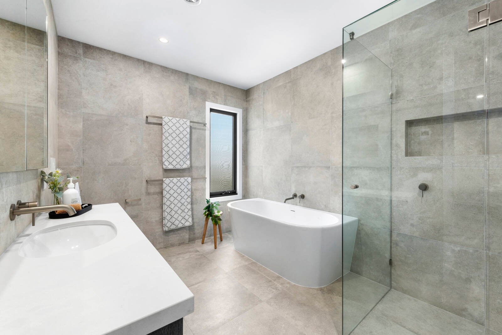 Comprising four bedrooms, the master is positioned upstairs and features walk-in robes and luxurious ensuite finished in beautiful floor-to-ceiling tiles, with frameless glass shower, modern vanity with stone benchtop, and quality fittings. Two additional bedrooms upstairs include built-in robes and are serviced by a spacious central bathroom with back-to-wall freestanding bath, continuing in the quality finishes of the home. A fourth bedroom on the ground floor is serviced by a third bathroom providing a versatile space that could also be used as a home office, guest room or teenager’s retreat. All bathrooms include underfloor heating adding to the sense of luxury.