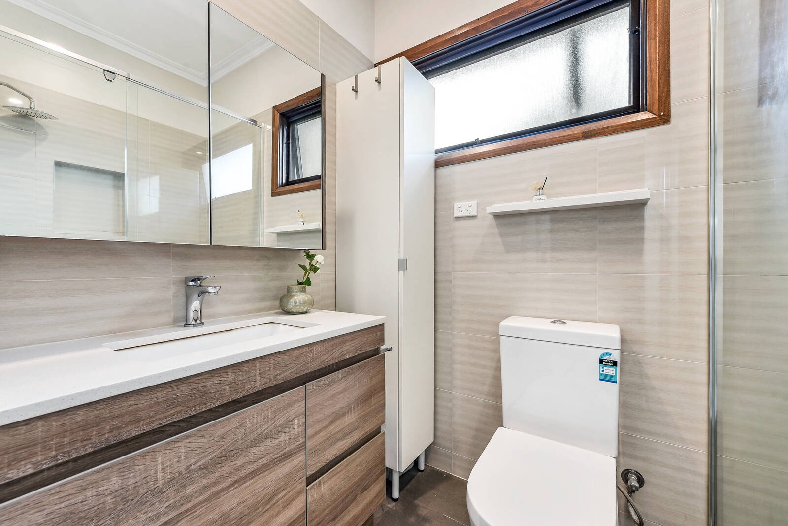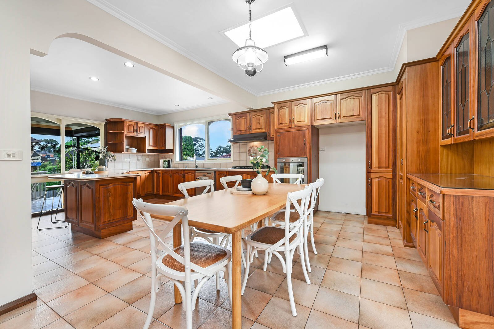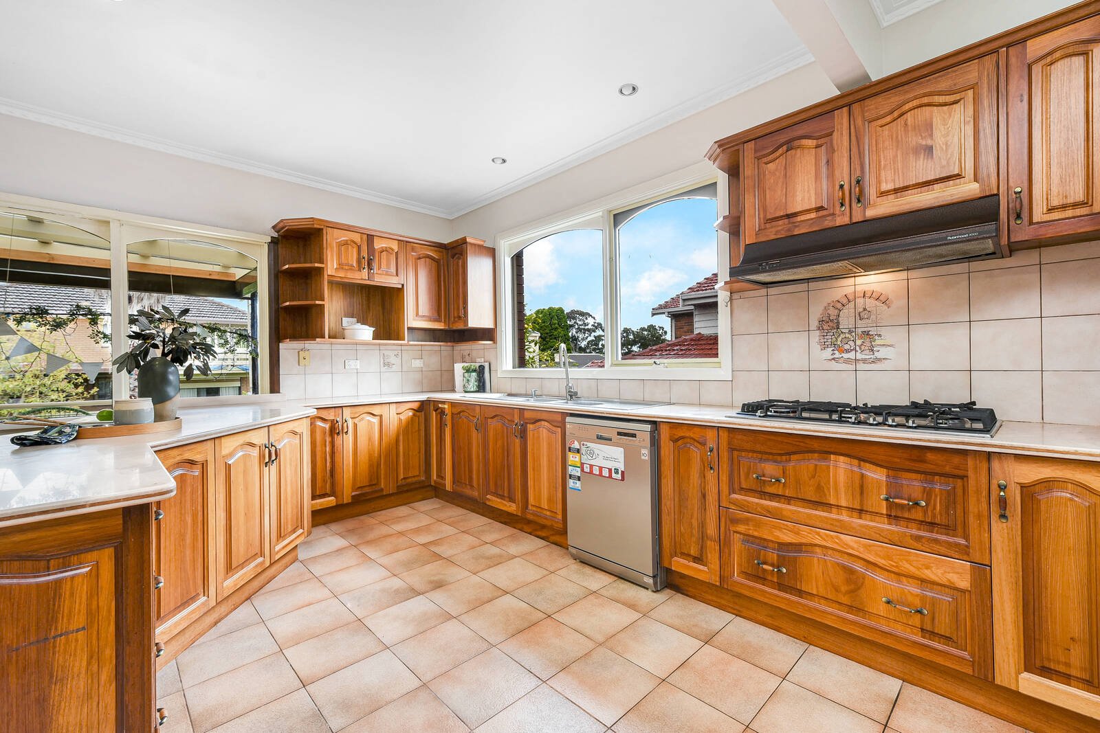 The spacious kitchen boasts a walk-in pantry and is abundant, finished in solid shaker-style timber. An elegant gooseneck mixer is complemented by a stainless steel dishwasher, while a wall-mounted oven and 900mm gas cooktop will please the home chefs.