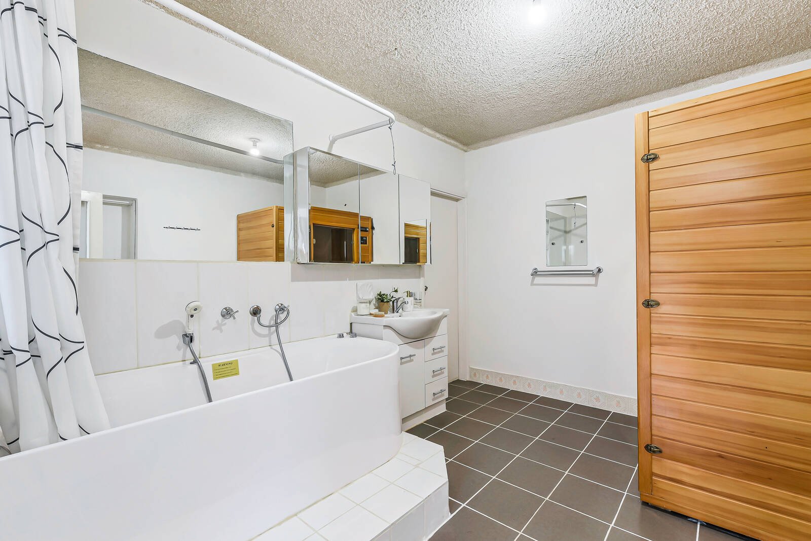 Five well-sized bedrooms provide built-in storage, while a sixth is utilized as a study with its own coffee nook. The master offers a walk-in robe and private ensuite. There are four bathrooms in total, all highly appointed and upgraded, with a variety of stunning features including full height wall tiles, niche shelving, double stone-top vanities, designer sink and tap ware, and even a sauna!
