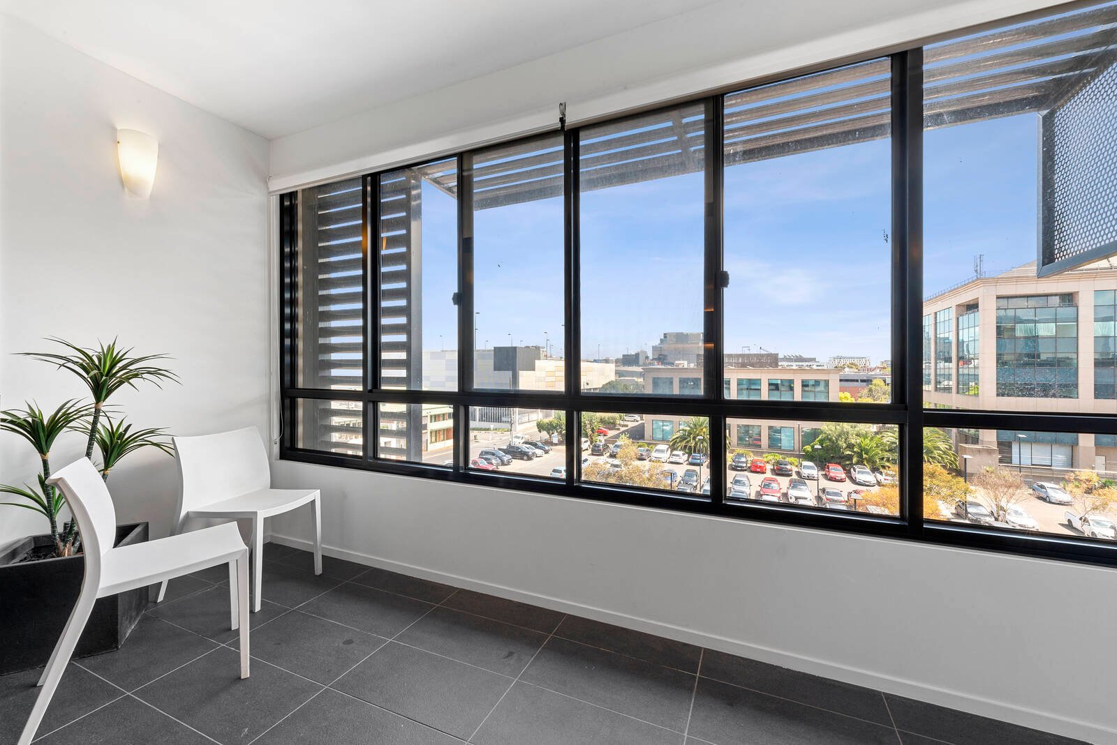 On entry to the apartment, a light-filled open plan and chic contemporary palette will immediately impress. Large glass sliders leading from the living to a Winter Garden balcony, fully enclosable for year-round use, offering a private space to enjoy a coffee or wine overlooking the city skyscape. A well-appointed kitchen features stone benchtops, glass splashback with LED strip lighting, quality Fisher and Paykel appliances, modern cabinetry and overhead storage.