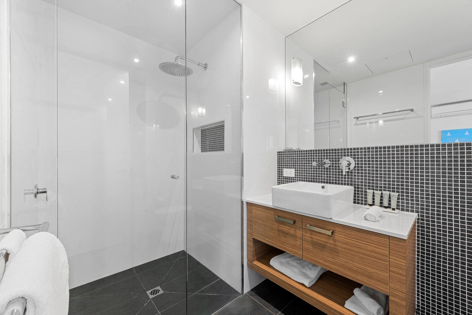 The separate bedroom is well-proportioned, offering city views, built-in robes, and elegant pendant lighting. A stylish bathroom features floor-to-ceiling tiles, modern vanity with stone benchtop, feature mosaic tile and quality fittings.