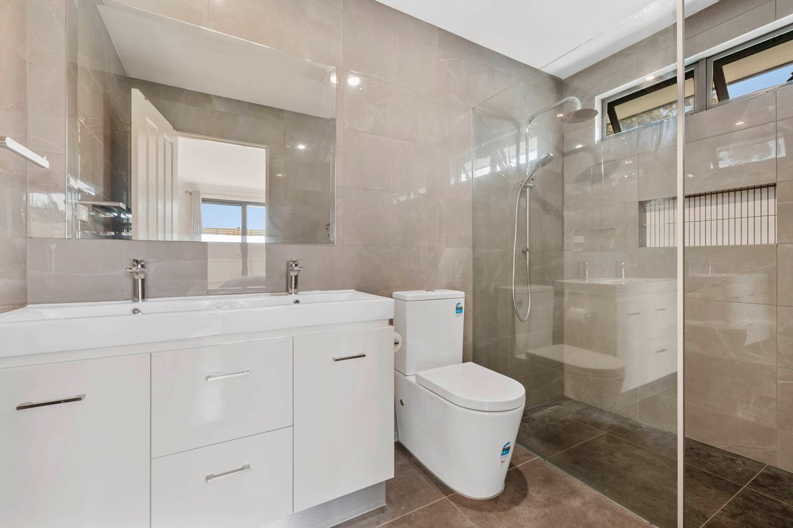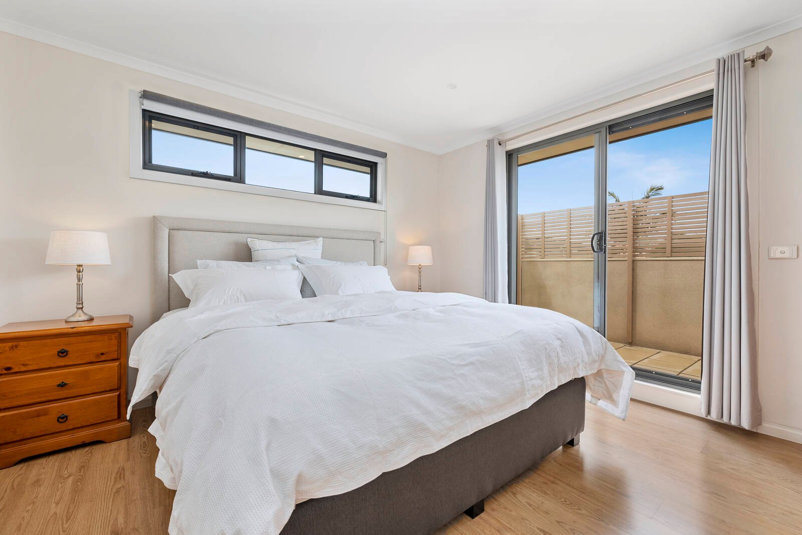 A skylit staircase ascends to 3 good-sized bedrooms including a master suite with ensuite/WIR and balcony shared with another bedroom, plus stylish ground and upper-level bathrooms.