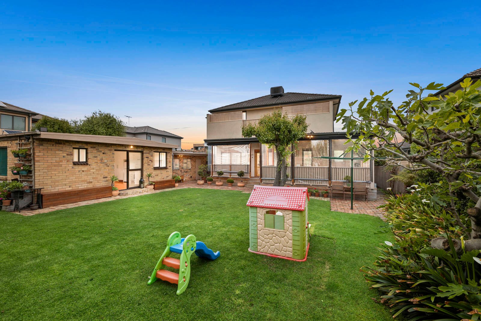 To the rear, a large covered deck with kitchenette and café blinds overlooks a huge family-friendly garden, creating a private setting for outdoor entertaining, while a self-contained unit/studio with kitchen and bathroom is ideal for investment or multi-generational living.