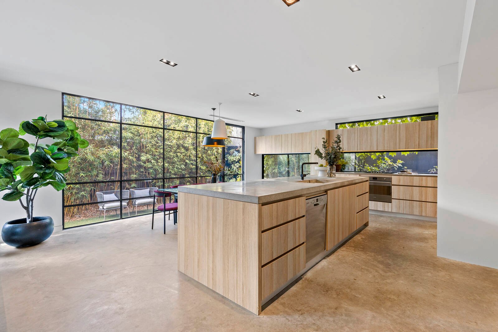 Concrete flooring and bespoke American Oak detail adds a chic aesthetic to spacious interiors, with vast open-plan living/dining and designer kitchen featuring huge concrete island bench and Bosch/Smeg appliances overlooking a low-maintenance bamboo courtyard.