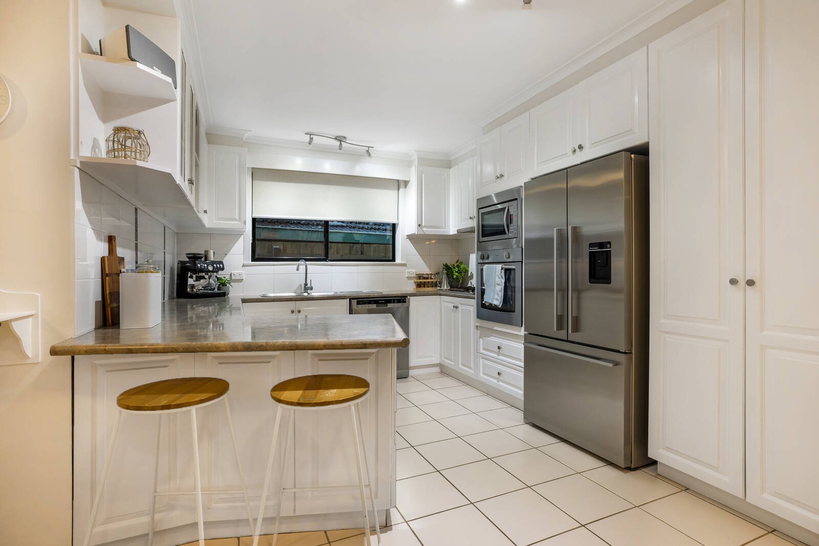 Upon entry, an open-plan living and dining area overlooks the front and rear gardens, set alongside a separate casual meals area. From here, a generously proportioned kitchen comprises stainless-steel appliances, ample storage space, and a breakfast bar for casual dining.