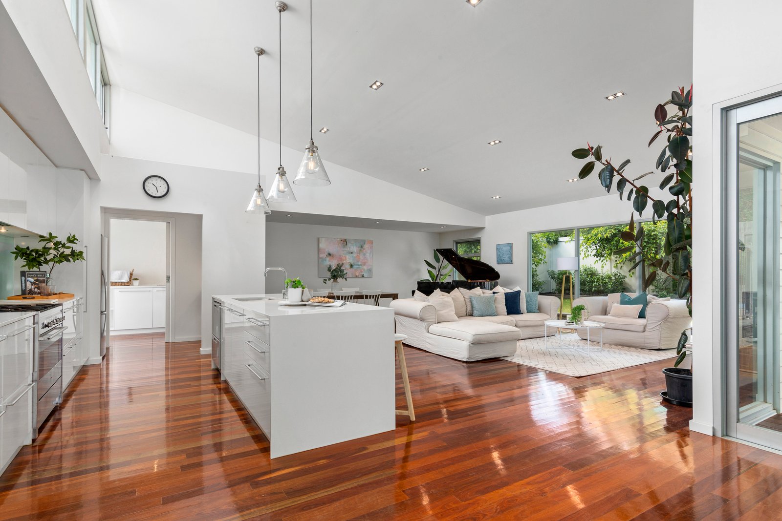 The first of two living areas resides in the original section of the home, featuring a beautiful fireplace as its centrepiece, offering an ambient space to relax or entertain away from the main traffic of the home. A seamless transition into the modern section of the home reveals a contemporary open plan with raked ceilings and north facing highlight windows creating a sense of light and space throughout. The elegant kitchen features a large island bench, waterfall stone benchtops, Smeg appliances, excellent storage provisions including walk-through pantry, and the optimum vantage point to oversee the dining, outdoor entertaining and out to the rear yard, perfect for everyday living and easy entertaining.