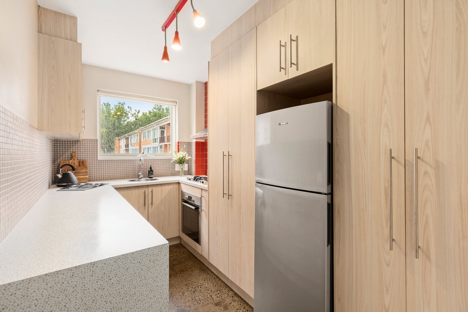 On a rear corner of an immaculate boutique building, spacious 1960’s proportions are kept beautifully bright by polished concrete floors and expansive, double-glazed windows that capture sun filled leafy aspects throughout. A generous lounge provides the ideal place to relax or entertain, catered to by a smart, fully equipped contemporary kitchen that features quality Bosch appliances and excellent storage.