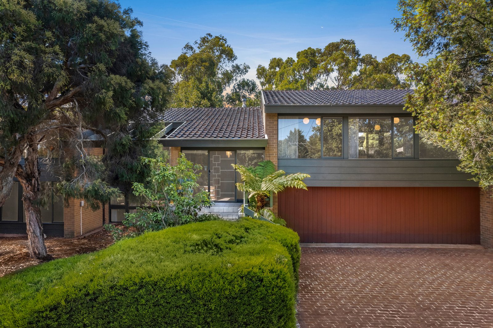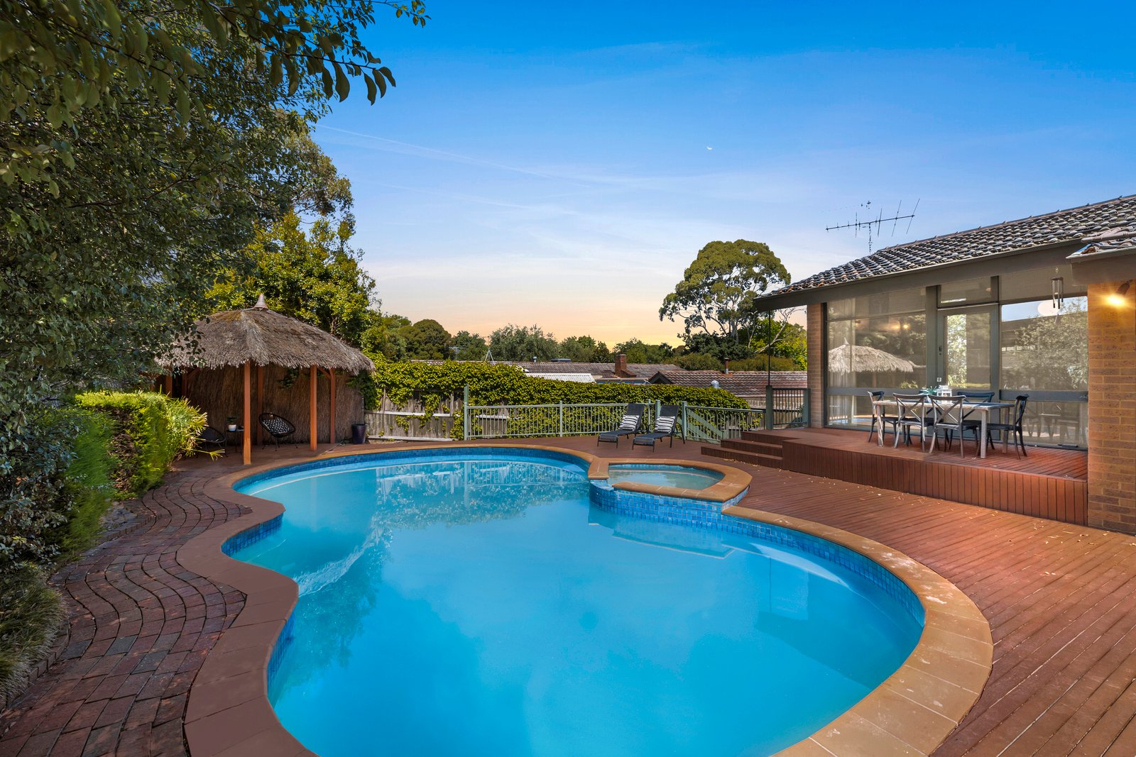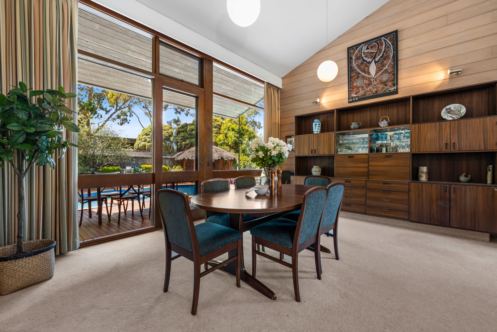 In a tranquil world of its own in a serene parkland setting, this abundantly accommodating 5 bedroom, 3 bathroom one-owner residence and expansive surrounds (992sqm approx) offers peace, privacy and plenty of space for everyone to enjoy. Perfectly laid out to cater for all ages and stages of family life, from children to adults. Your very own lifestyle escape full of retro style and garden outlooks, this home is characterised by its soaring raked ceilings, timber panelling and solid brick construction. Architecturally designed with multiple living zones, split-level interiors provide formal lounge and dining rooms, updated Granite kitchen/meals area, huge rumpus room with kitchenette and home office. Enjoy the resort-like exterior, with a private terrace overlooking the in-ground swimming pool/spa and cabana, paved entertaining courtyard and gated access to Toirram Reserve – all immersed in beautiful established native gardens. Enjoy as is or add contemporary glamour to immaculate interiors, complete with in-floor zoned heating, dual-zoned AC, ducted vacuum, irrigation system, wine cellar, storage room, huge laundry and triple garage with workshop and internal access. This owner-built home is located in a quiet court setting providing a safe environment for children, just minutes to Mount Waverley Village shops and train station, close to schools including Mount Waverley Primary School, M1 Freeway and Mayfield Park. Zoned for MWSC.