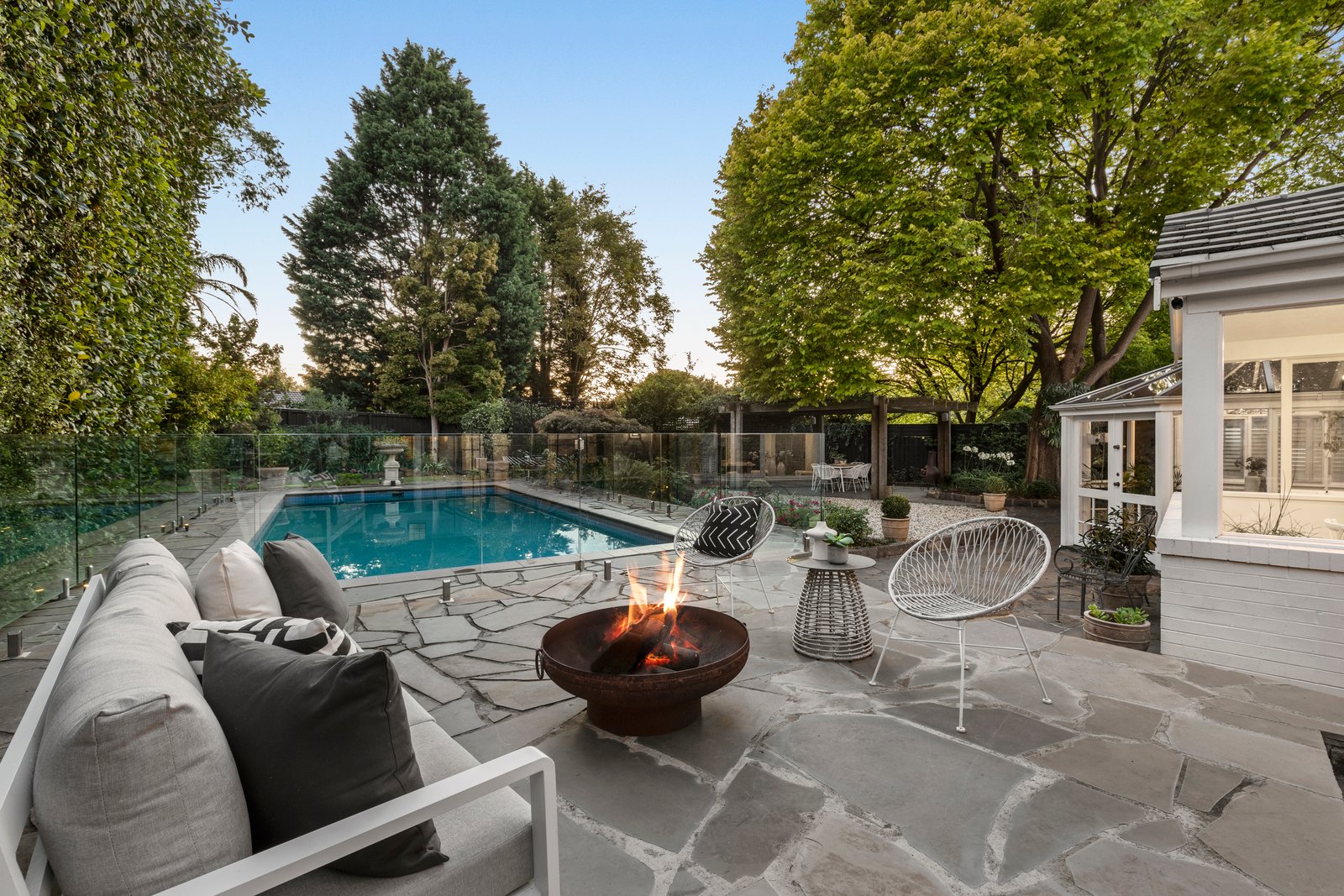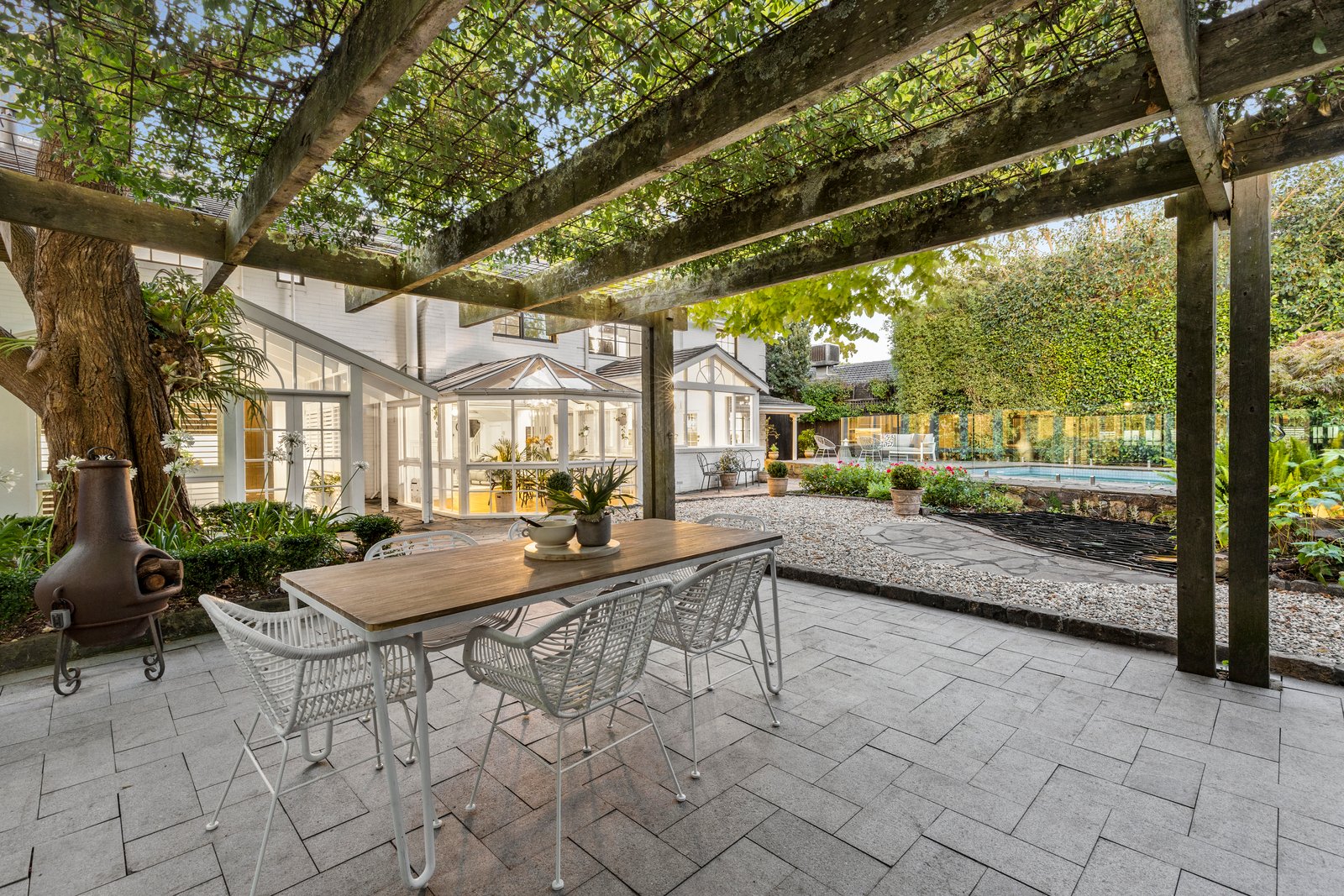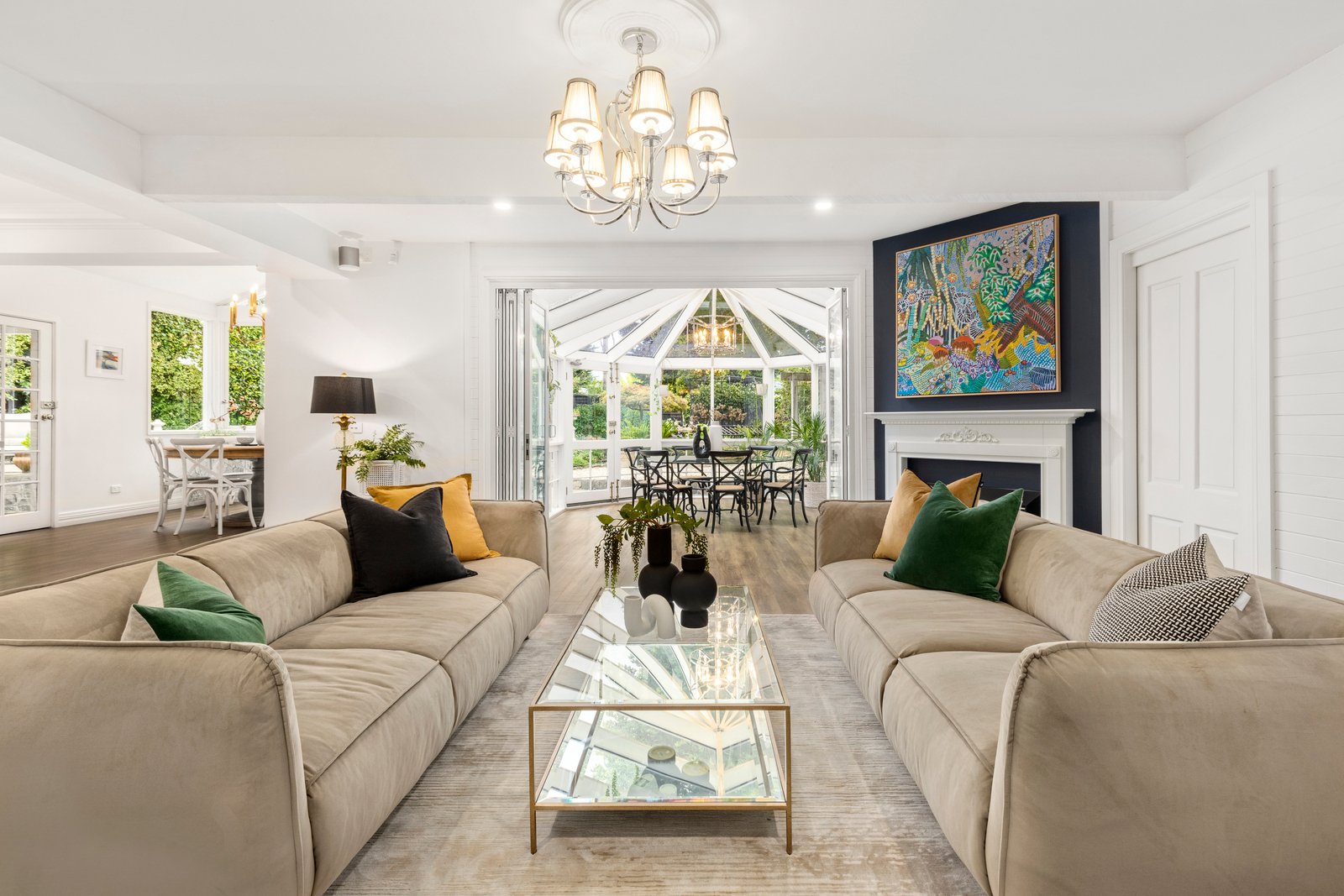While every room has its own ‘wow’ factor, the hero design feature is arguably the stunning conservatory dining room – breathtaking as the centre piece of the open plan kitchen and family room, infusing the entire south wing with light from its lofty peaks, and perfectly positioned to overlook the custom paved heated pool and al fresco dance floor.