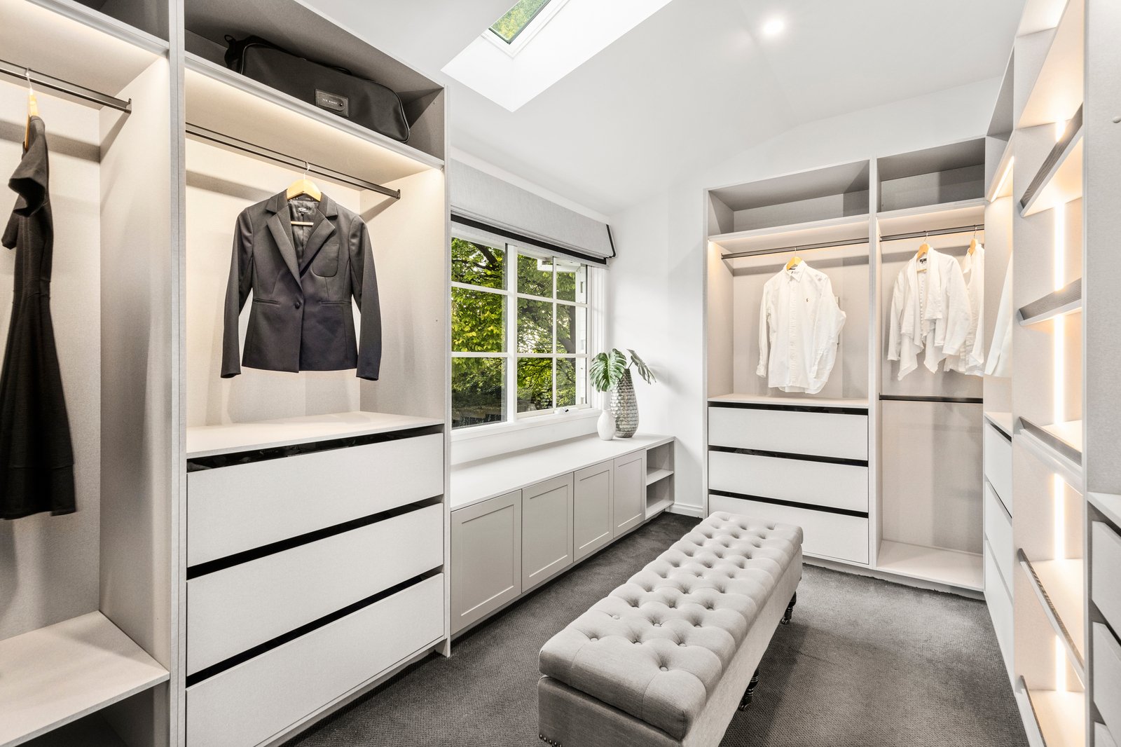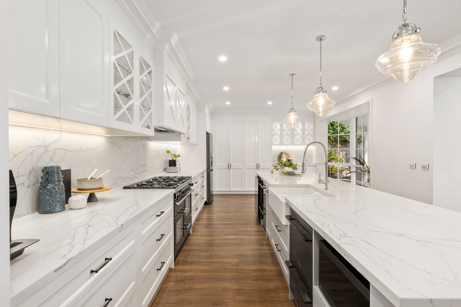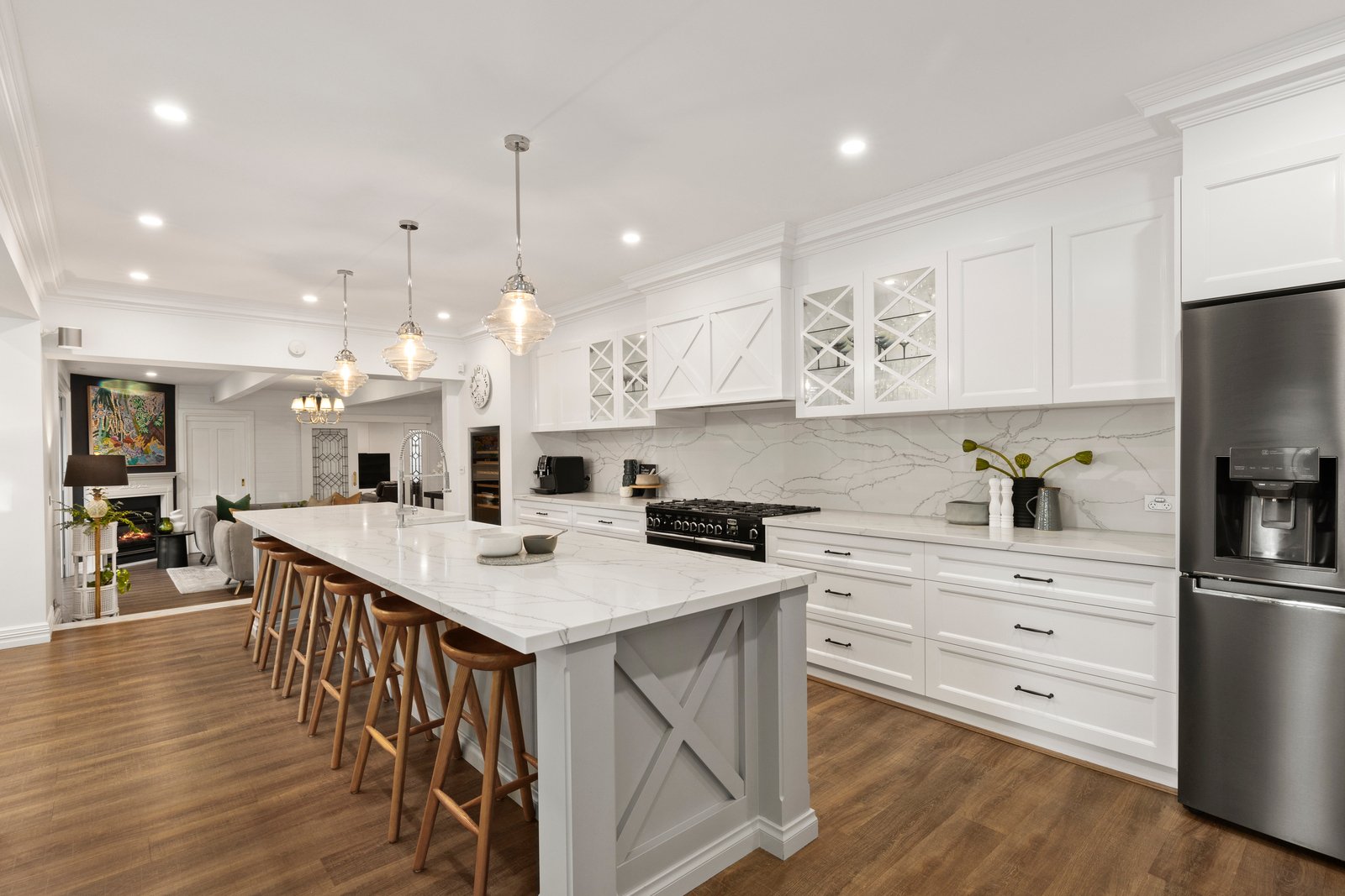 The 1965 built foundation stands as a testament to a signature property on a secluded 1253sqms (approx.), now exquisitely detailed with luxury finishes including dramatic pendant lights, LED mirrors, and a Hamptons style entertainer’s kitchen with an esteemed British Falcon cooker, double twin-drawer dishwashers and Vintec wine storage to keep your collection at the perfect temperature.