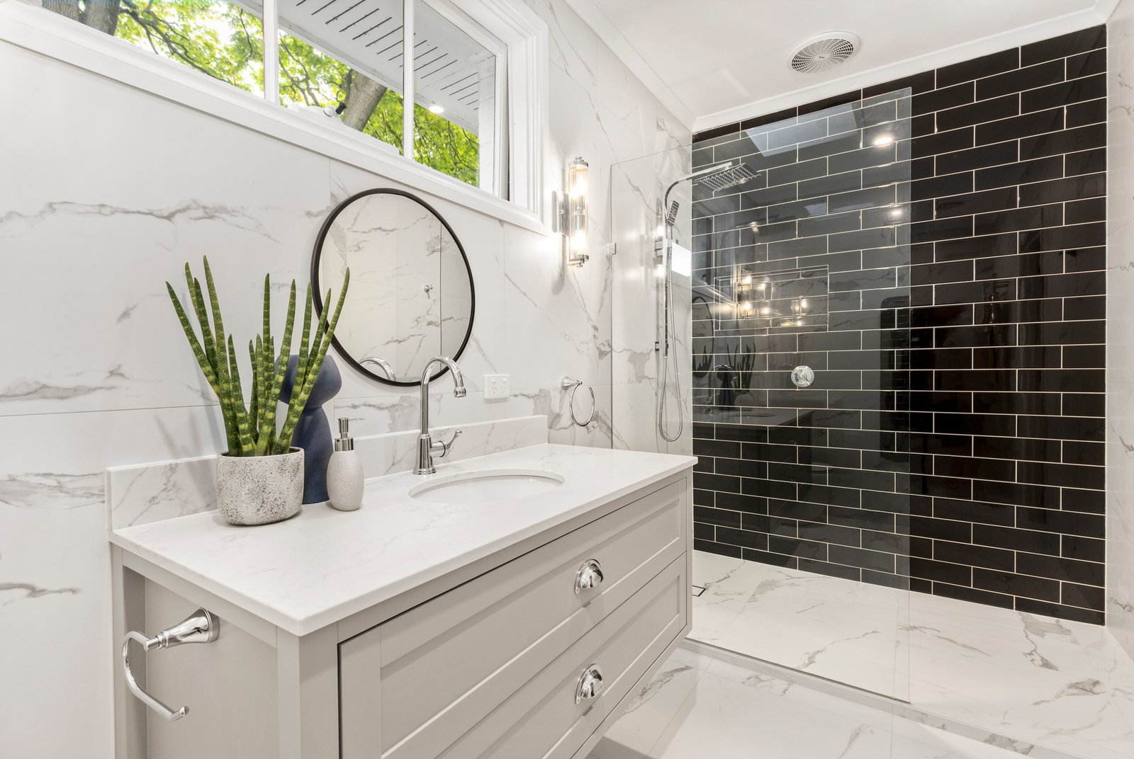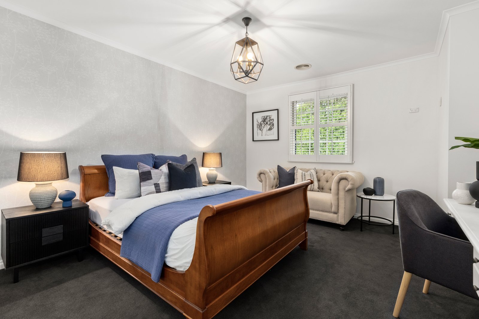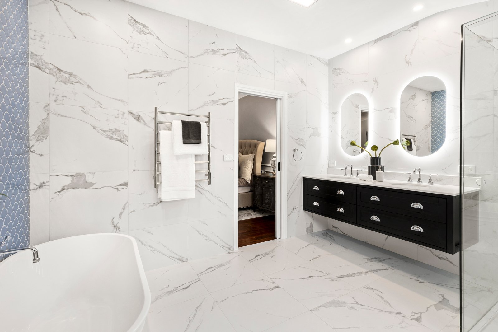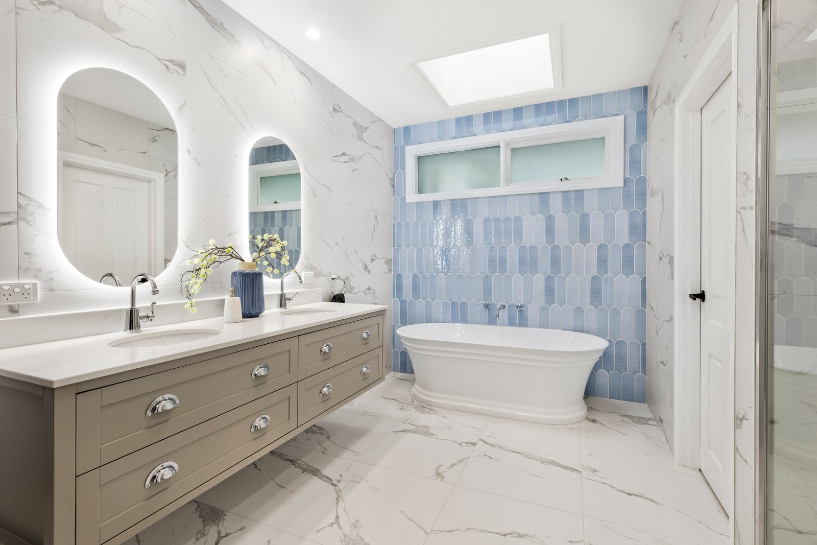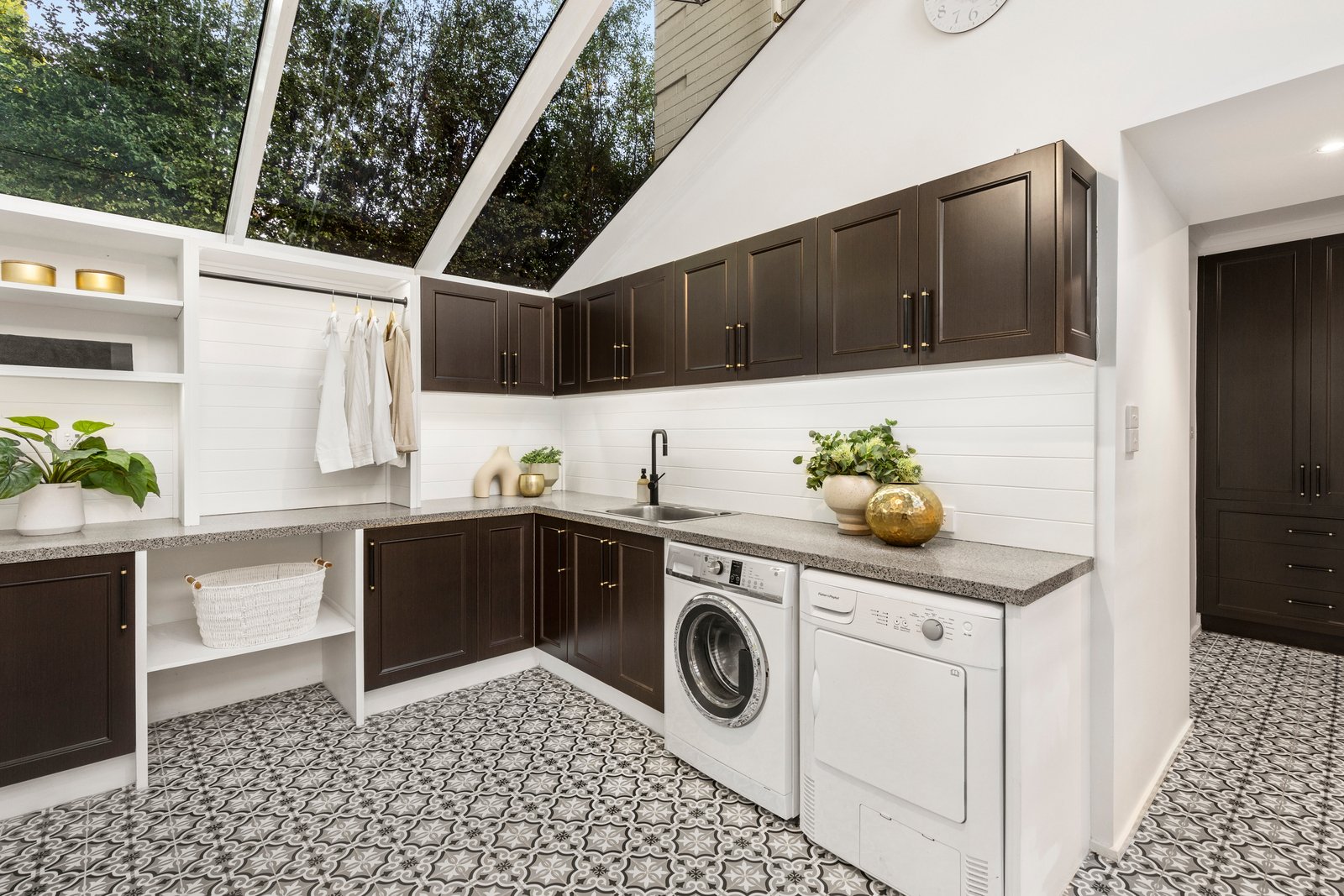 The modern polish on show in the kitchen, bathrooms and laundry is equally striking, with thoughtful tile and cabinetry choices adding to the feel of a high-end country house ready to wrap you in relaxation.