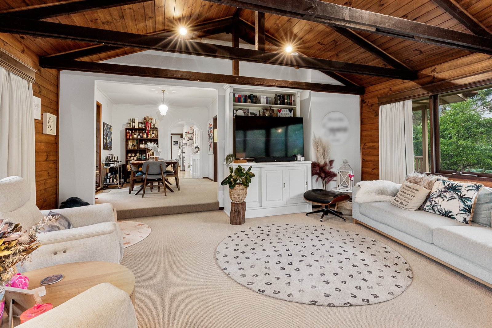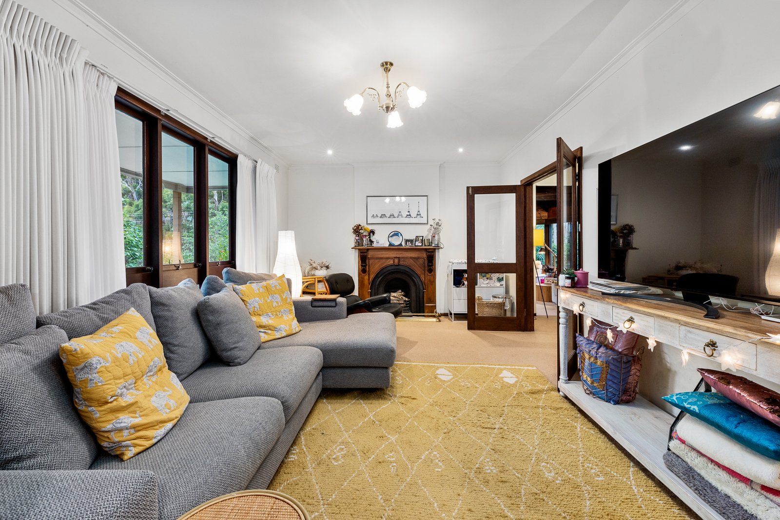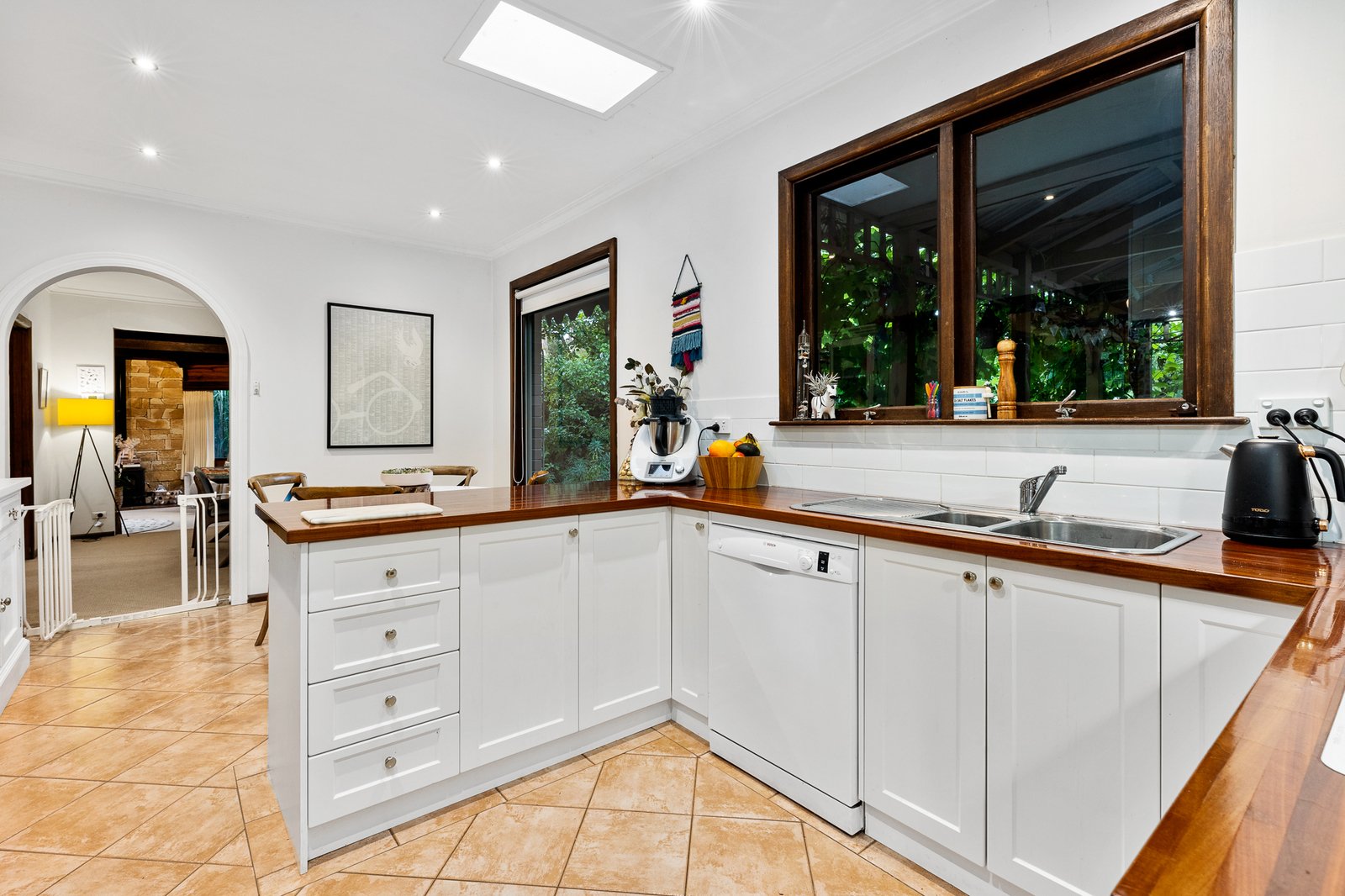 Open plan kitchen, meals area is equipped with wood bench tops, electric stove top, oven, dishwasher and ample storage. Adjoining is a formal dining area with access through to the living area featuring an open plan fire place. Close by is a second living area showcasing surrounding windows, wood combustion fire and exposed wooden ceiling. There are three generous sized bedrooms all with built in robes. Close by is the updated family bathroom with large claw foot bath, wooden vanity and separate toilet.