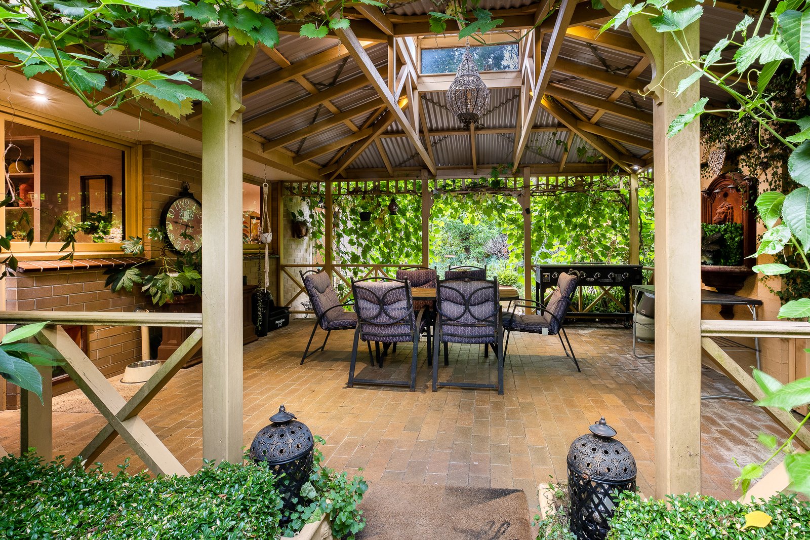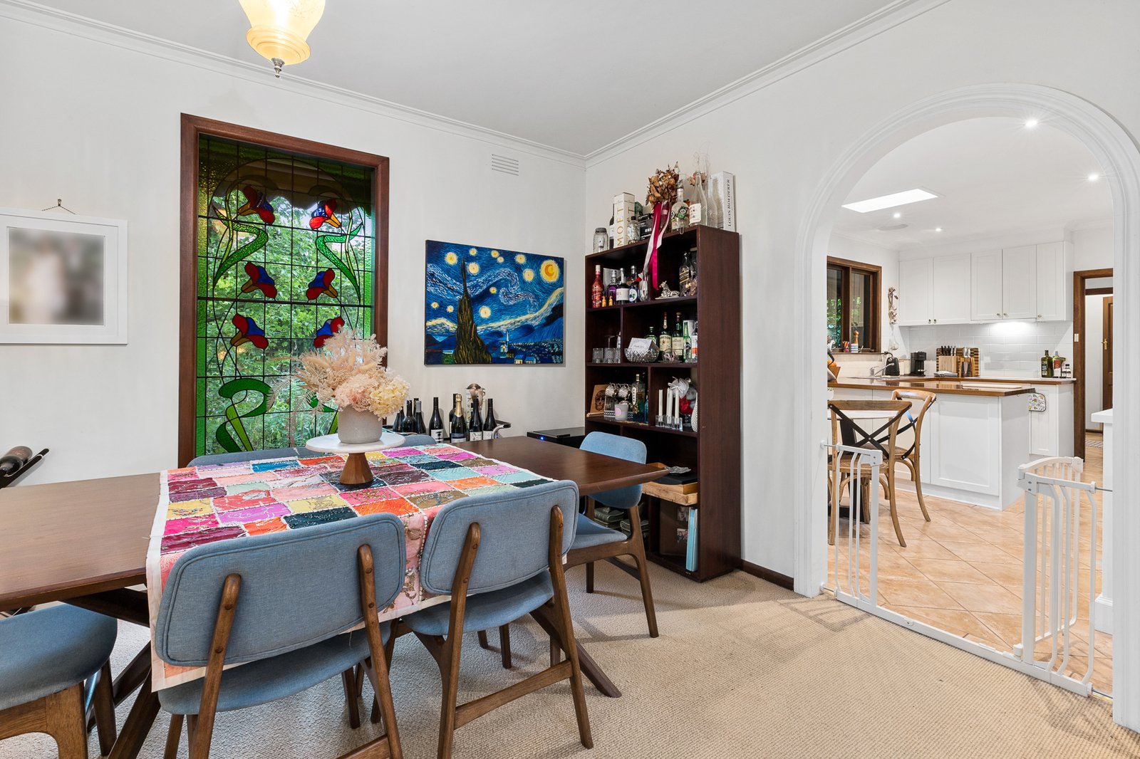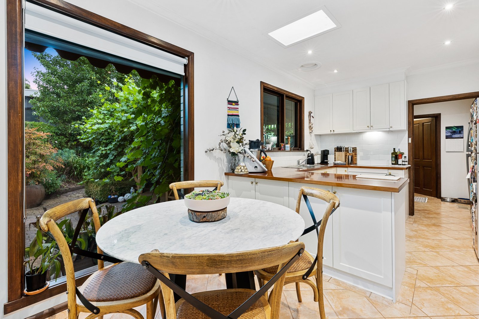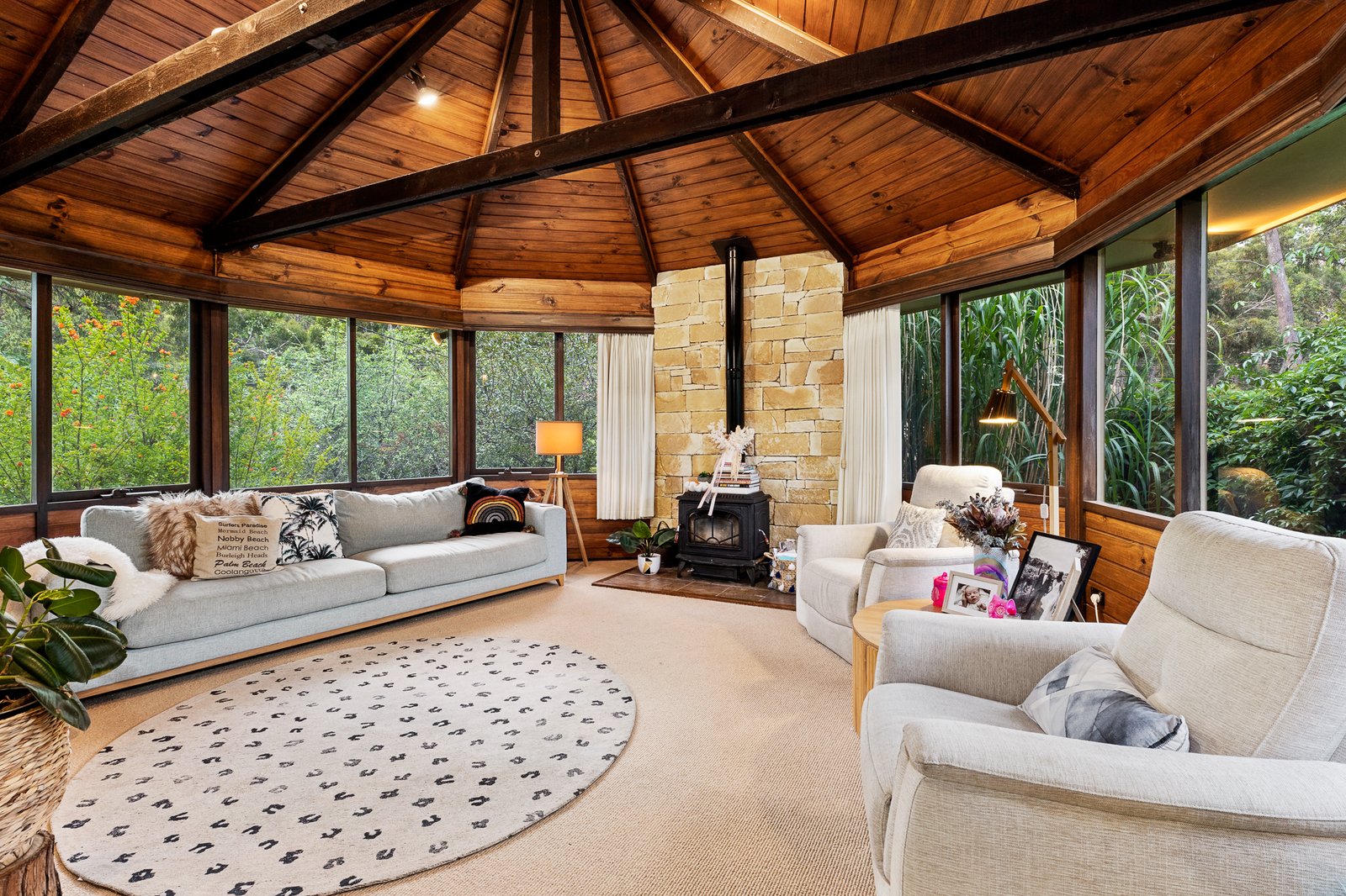 Open plan kitchen, meals area is equipped with wood bench tops, electric stove top, oven, dishwasher and ample storage. Adjoining is a formal dining area with access through to the living area featuring an open plan fire place. Close by is a second living area showcasing surrounding windows, wood combustion fire and exposed wooden ceiling. There are three generous sized bedrooms all with built in robes. Close by is the updated family bathroom with large claw foot bath, wooden vanity and separate toilet.