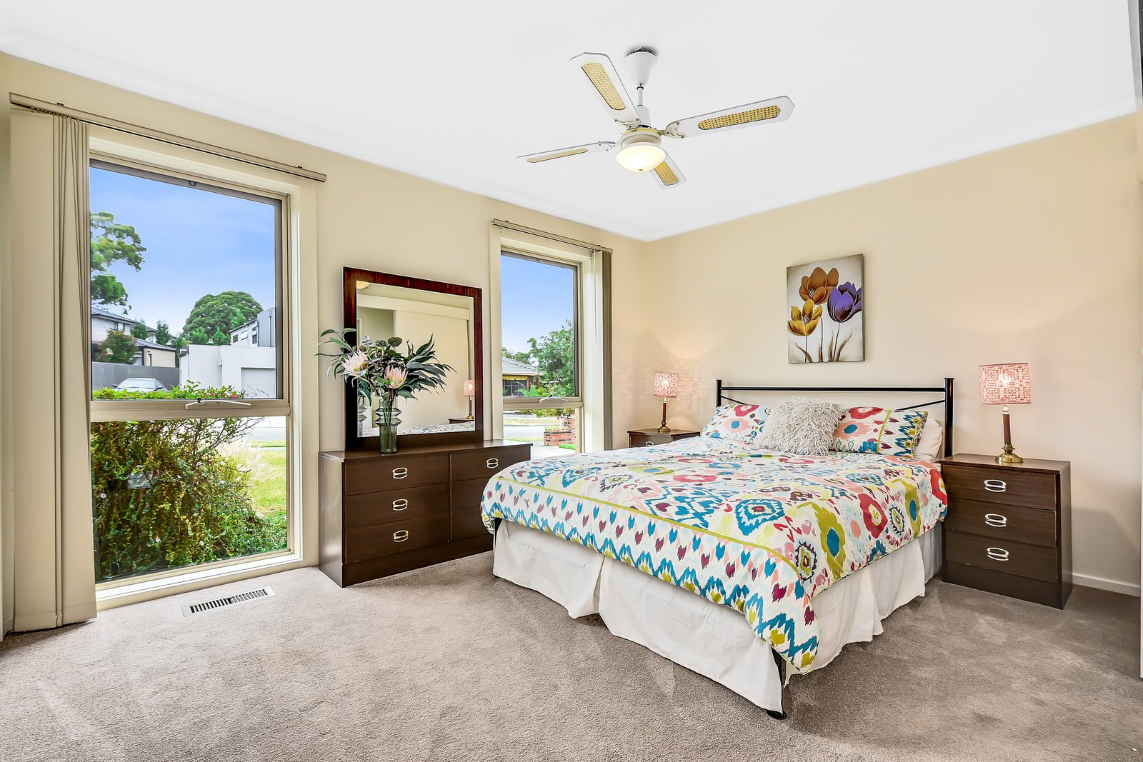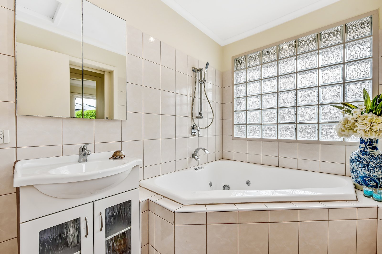 Three well-sized bedrooms are carpeted and offer ceiling fans. Two bedrooms have built-in robes, while the main showcases a private ensuite. Both of the home’s bathrooms are neatly appointed and well-presented, with a deluxe jet spa bath and opaque glass brick feature window to the main bathroom.