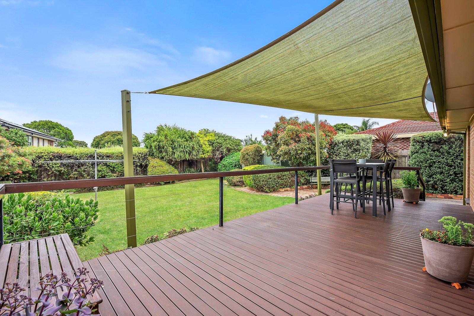 The main entry to the home is protected and kept private by an arched vestibule-style passageway. Inside, buyers are presented with a traditional L-shaped open-plan living and dining space, sun-lit and illuminated by down lights and a feature pendant to the dining zone. Polished timber floorboards are luxurious, while the home is kept comfortable with evaporative cooling, ceiling fans and ducted heating. A spacious timber entertaining deck looks out across the expansive, manicured backyard where the kids will love to run around.