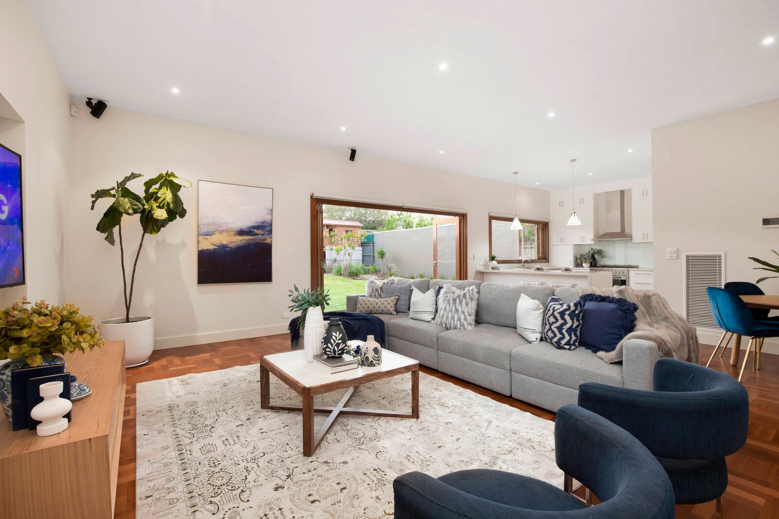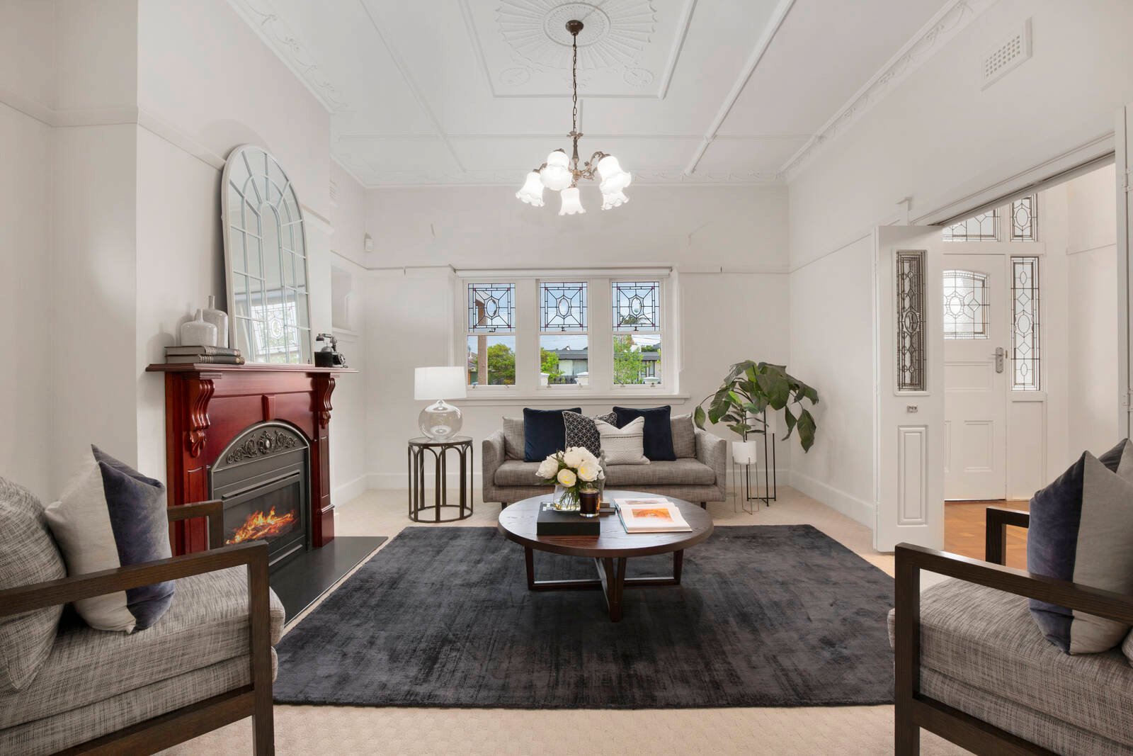 Now ready to welcome a new family, features include a formal lounge and dining room (both with fireplaces) alongside an expansive living and relaxed meals area. Bi-fold doors can be thrown open to seamlessly link the interiors to the beautiful family-friendly rear garden featuring a patio, undercover entertaining area and cubby house. The designer kitchen with servery window has been refurbished to please, offering quality Miele and Ilve appliances, and has the convenience of a combined butler’s pantry and laundry.